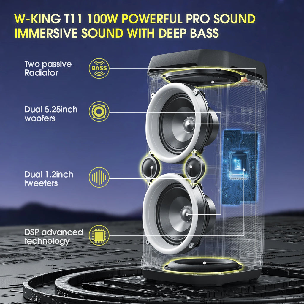 【220W Peak Large Party Bluetooth Speaker & 115dB Huge Sound】W-KING T11 party bluetooth speaker has two LARGE SUBWOOFERS that deliver remarkable low frequency response and massive, deepest bass. The party large speaker matched with the two huge passive radiators above and below producing the richest and authentic bass. And the advanced DSP chip bring the cleanest sound. W-KING T11 bluetooth speaker loud bring big party shock with115dB massive sound and 220W peak 110W RMS output