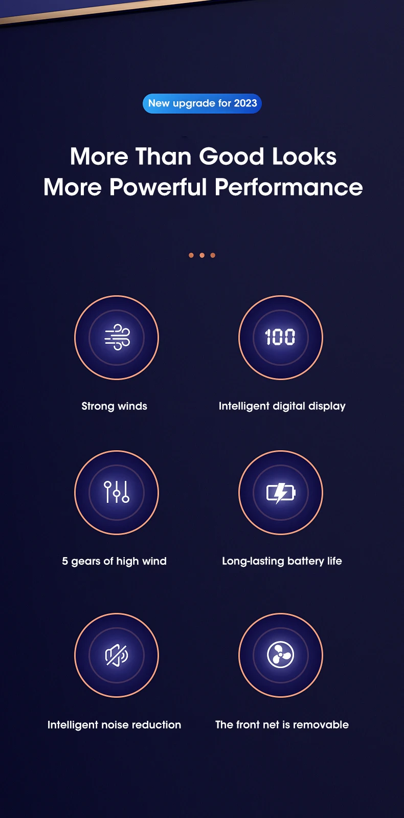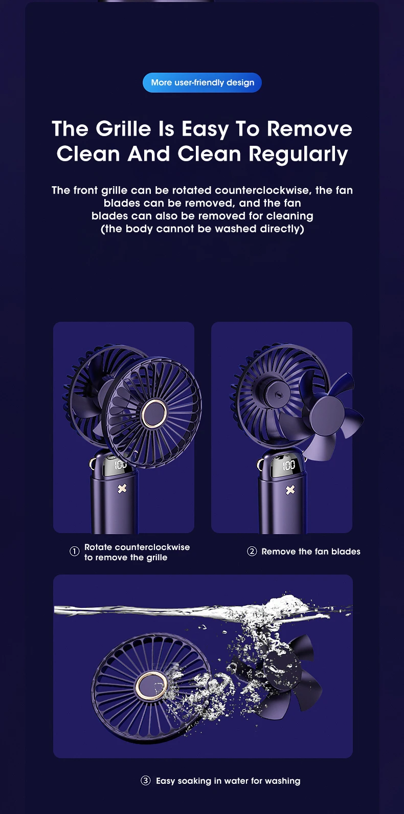 2. USB Charging: The upgraded version of the fan has a built-in 3000mAh large-capacity rechargeable lithium battery to ensure a longer use time.