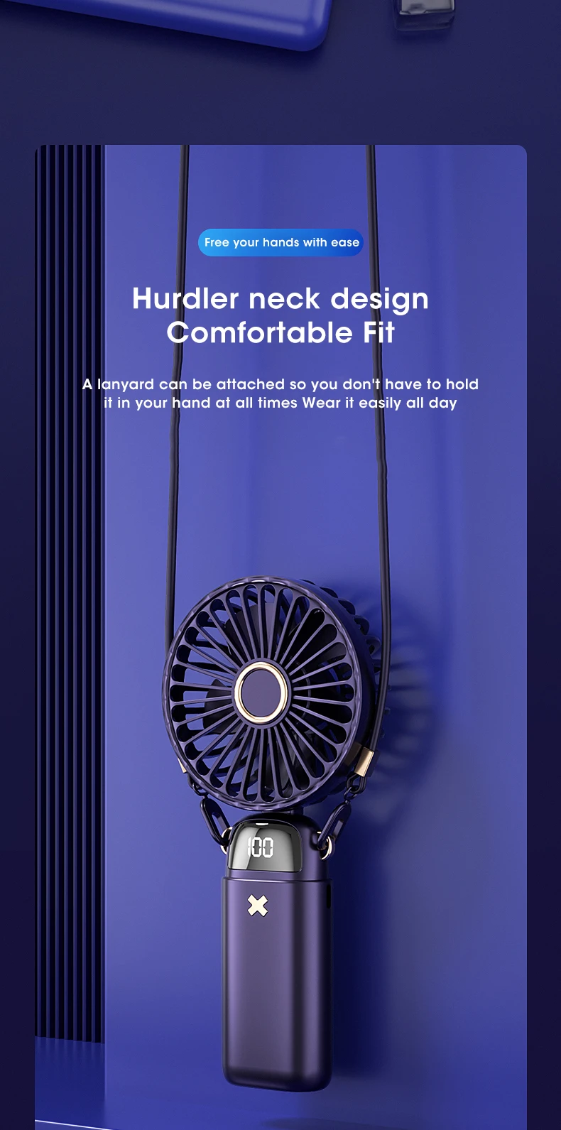5.Equipped with a hanging rope, it is not only a desktop fan and phone stand fan, but also a neck hanging fan.