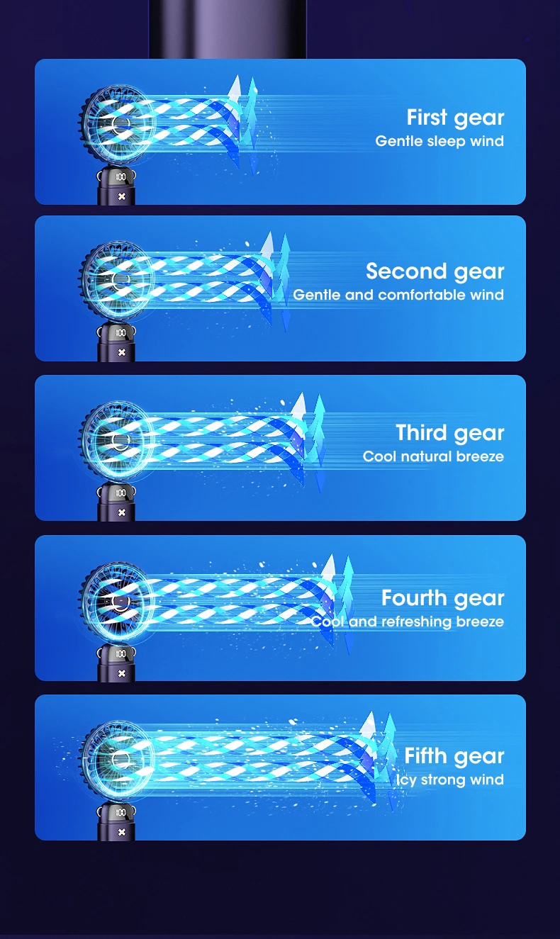 3. Five-speed Adjustable Wind Speed: The handheld fan quietly provides a gentle breeze at low speed. Medium speed provides cool wind and high speed creates powerful air to help cool you down in seconds.