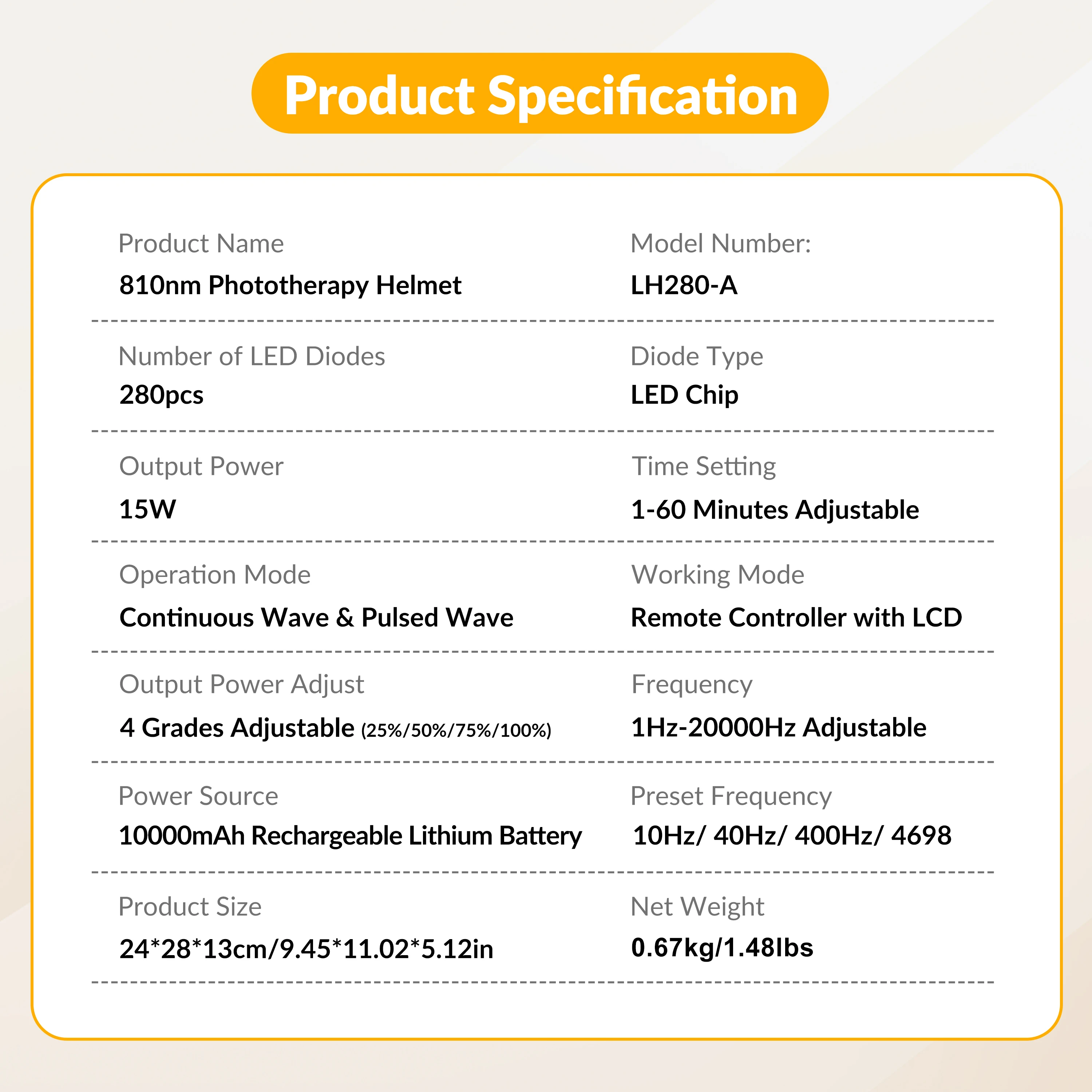 【Multi-functional & Easy to use】The infrared light Brain therapy equipment have Common 4 Preset Frequency:10Hz/40Hz/400Hz/4698 Hz.  Time 1-60 minutes Adjustable; Power:25% 50% 75% 100% four levels adjustable; Mode:CW-continuous wave and PW-pulsed wave at 1-20000Hz adjustable to meet your different needs. Supports DC charging and 10000mAh rechargeable battery, can work during charging as well. To get the most out of your PBM 810nm infrared light therapy helmet,consistency is the key. We recommend 20min each time, 1-2 times per day to 24 weeks or more.Our red light wearable helmet are light and portable, easy to use, you can use the red light therapy helmet for brain while you are wacthing TV or reading books.