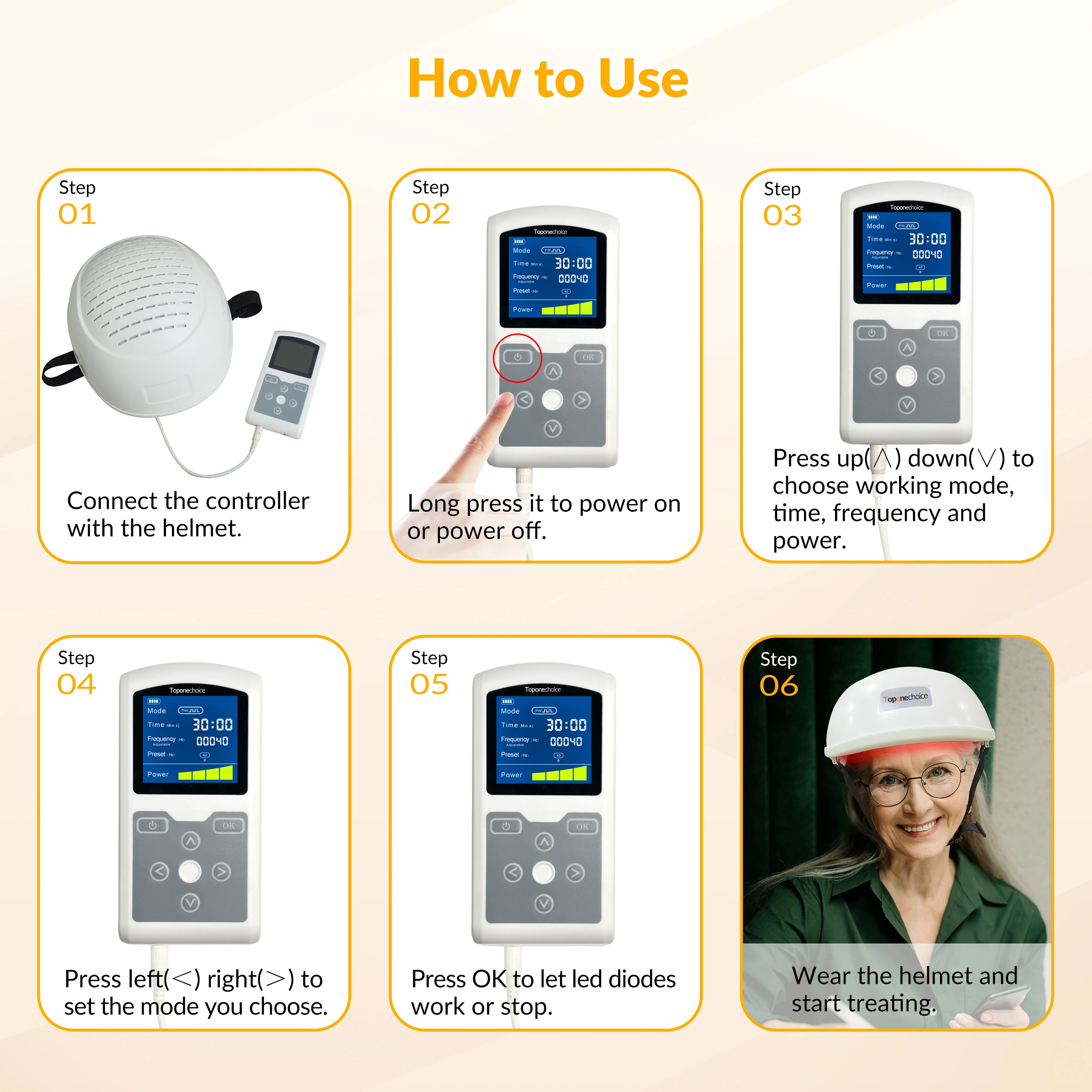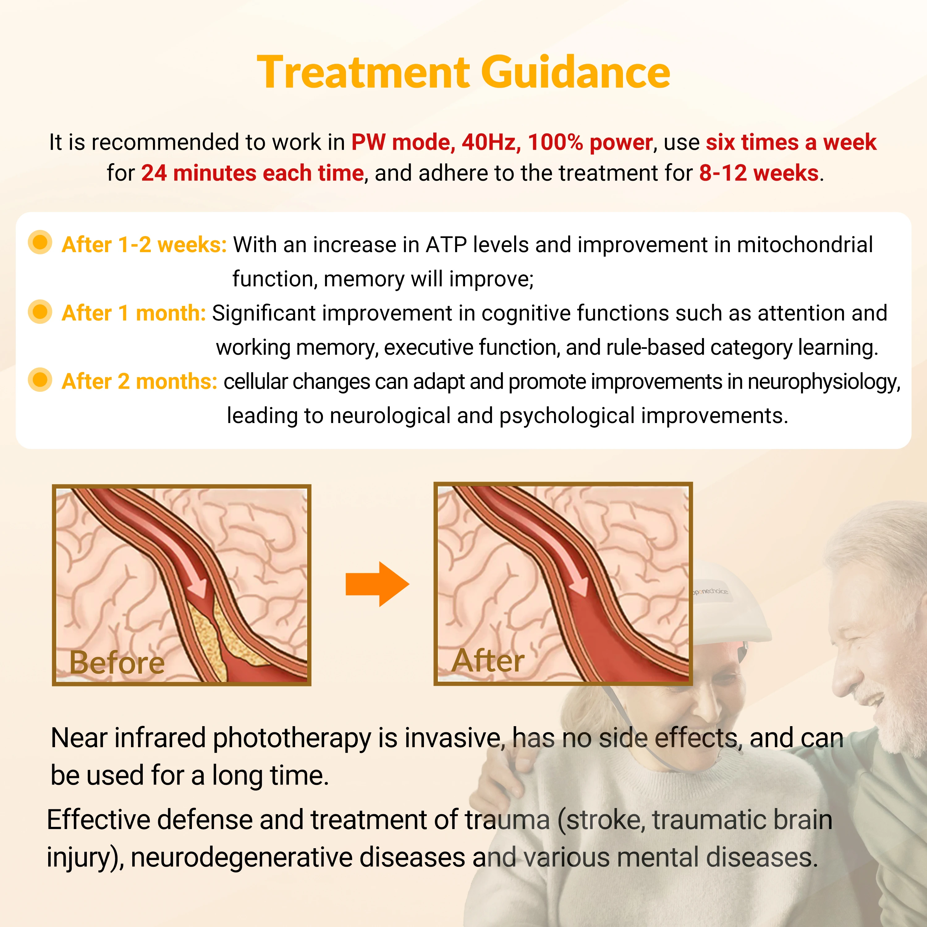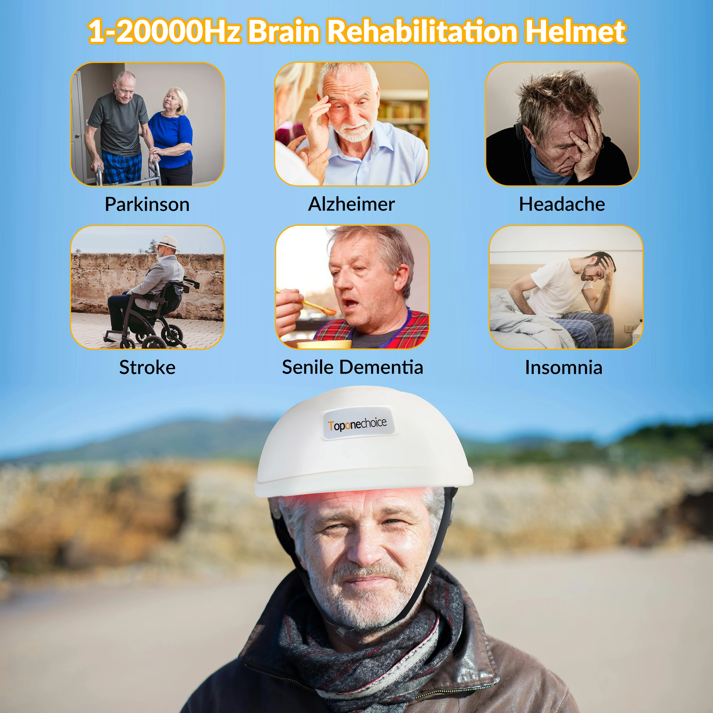 【More Applications】The physiotherapy helmet is helpful for the people who have the following troubles: Brain degeneration like Parkinson, Alzheimer,Dementia;    Low cognitive ability (memory, learning ability, comprehension);  Brian traumatic events: Stroke, cerebral palsy,Traumatic brain injury(TBI), Global ischemia, Brain injury, Headache, Migraine and Insomnia;Psychiatric disorders like Depression, Anxiety, Post Traumatic stress disorder,Aphasia,Autism spectrum disorder (ASD). In general, the brain neuromodulation helmet is effective to promote brain recovery and improve cognition ability.