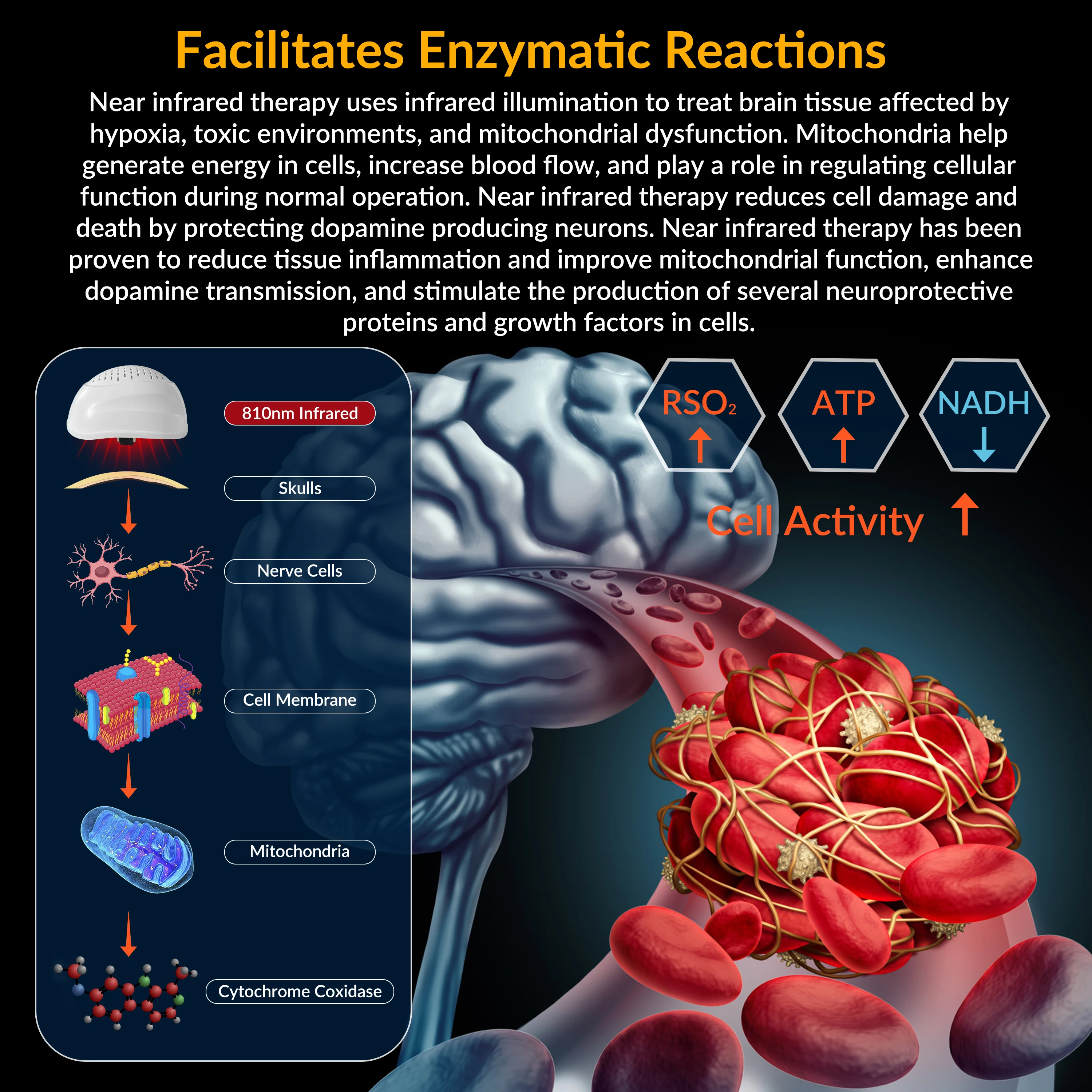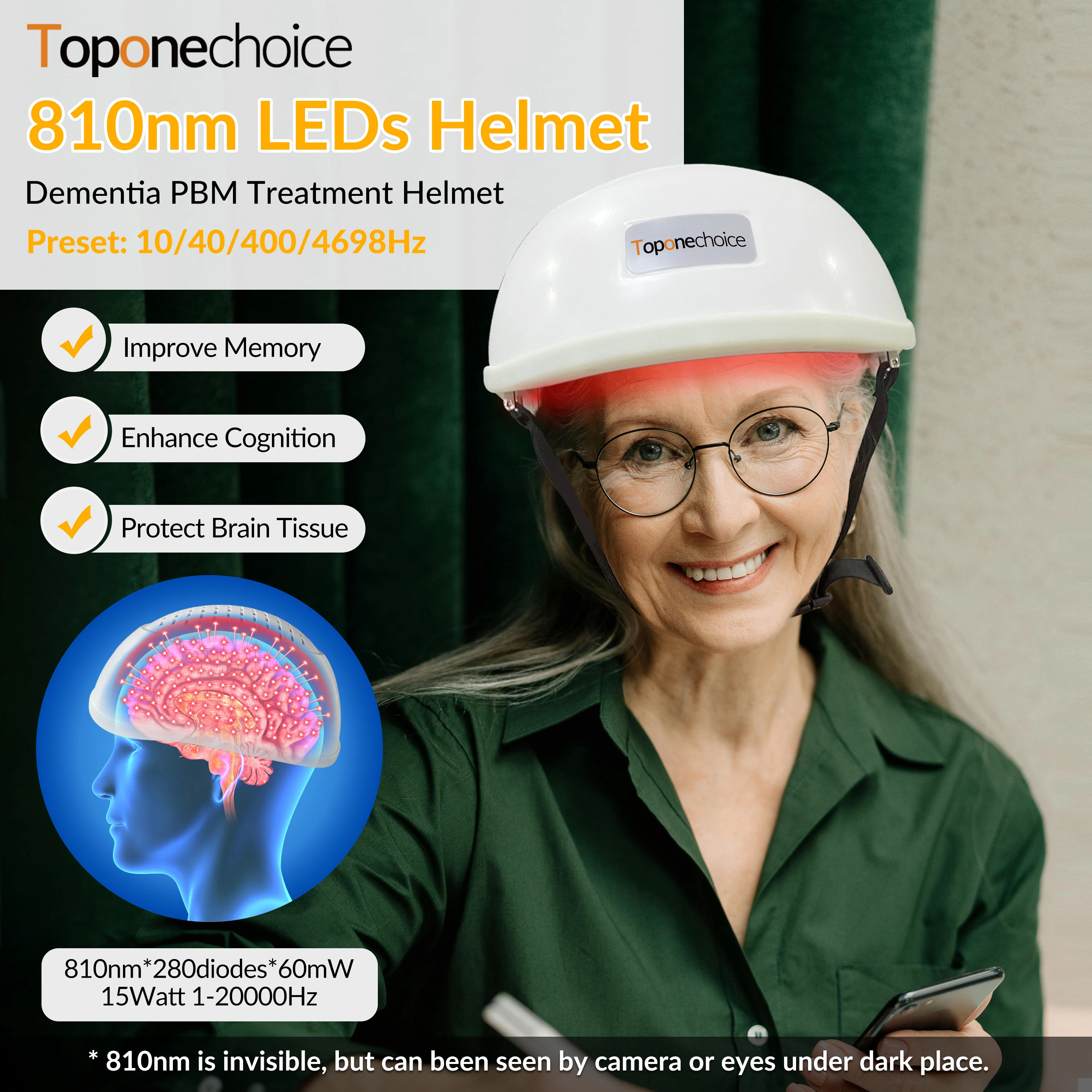 It applies infrared led lights extend through skull, penetrate deep into brain tissue, increase ATP production and blood oxygen to the brain tissue,boost the brain activities, improve memory and enhance cognition.