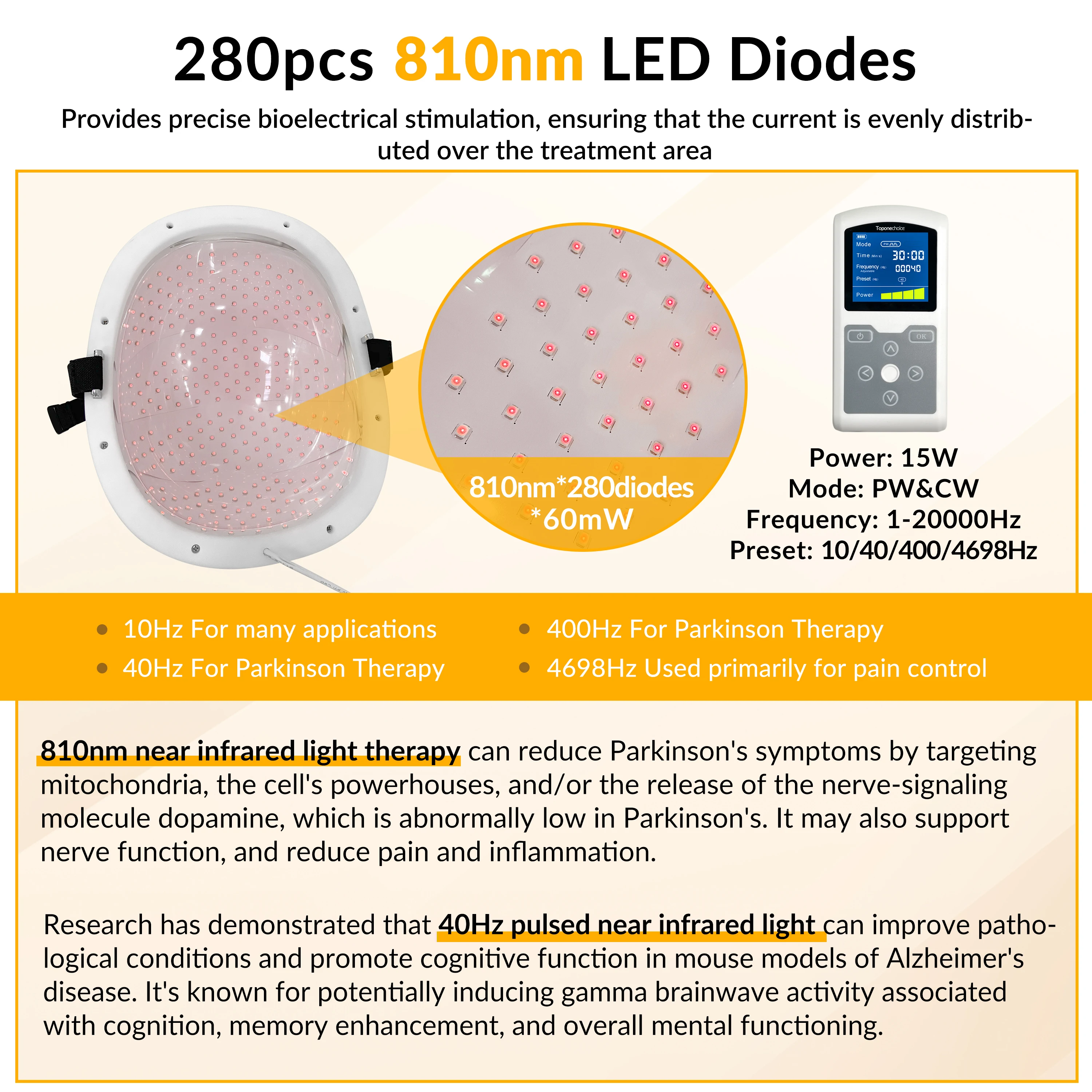 810nmx280pcs 15W NIR Red Light Therapy PBM Brain Neuromodulation Helmet Parkinson Alzheimer Treatment 1-20000Hz Adjustable