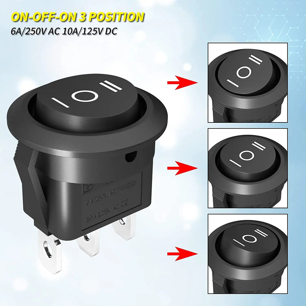 • Round Rocker Switch: This is an on off on switch 12v, 3 pin switch, SPDT 3 position design. Round Rocker Switch Rating: 6A/250V AC, 10A/125V DC.