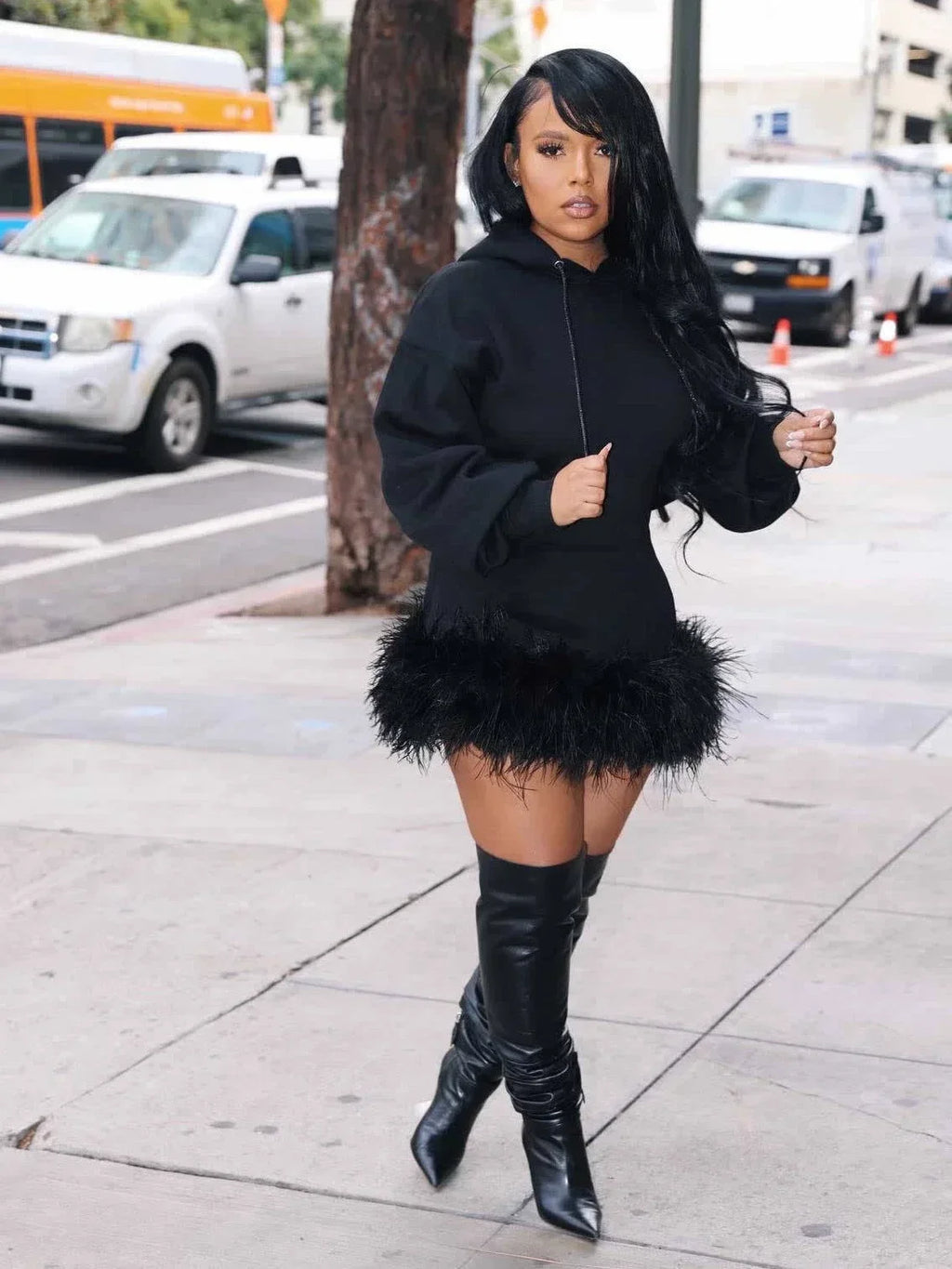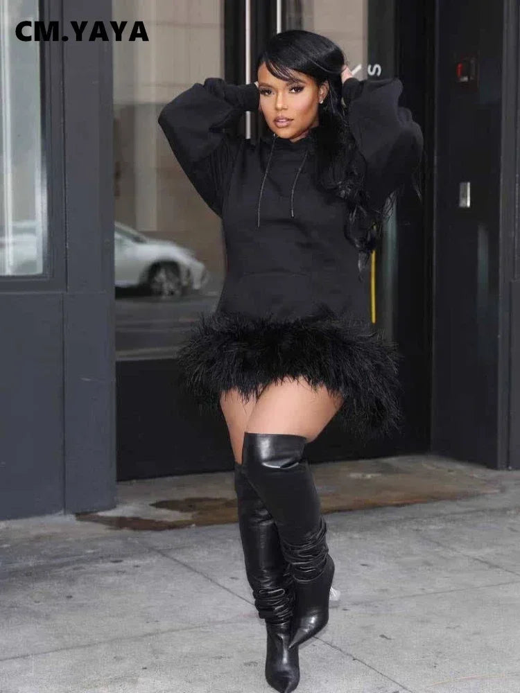 CM.YAYA Women Hooded Long Sleeve Fur Hem Sweathirt Style Midi Dress 2023 Winter Fashion Streetwar Mini Black Dresses Vestidos