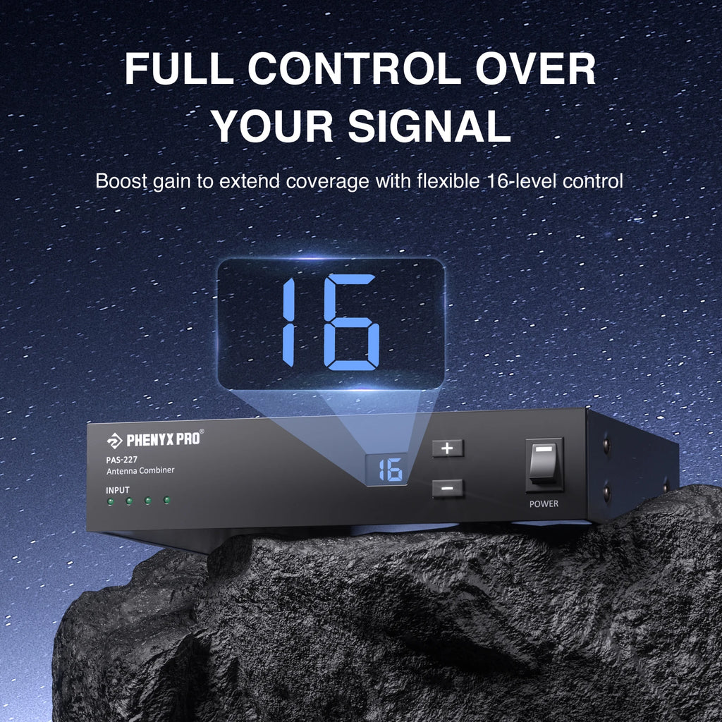 Designed to tackle complex IEM setups, the PAS-227X antenna combiner brings order to the chaos. By seamlessly merging up to four IEM signals into a single output, it creates a cleaner RF environment. Its directional antenna paddles allow flexible placement to find the ideal spot for signal transmission. Whether navigating crowded RF conditions or working in large venues, the PAS-227X truly shines.