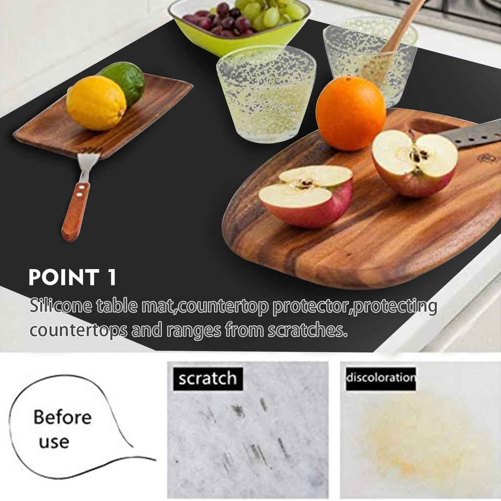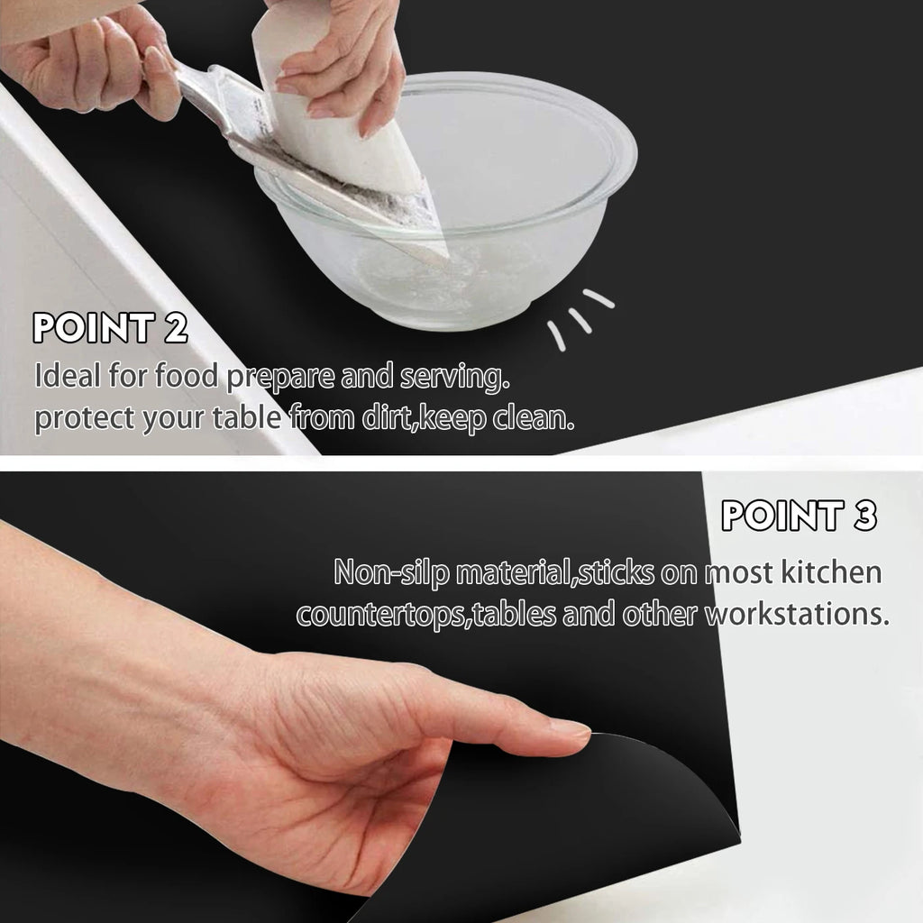 【HEALTHY, FOOD GRADE】: The kitchen counter mat is made of food grade silicone which can directly contact food. Odorless, kids and baby use friendly. It is reusable and environmental. Large table mat heat resistant between -40°F to 482°F.