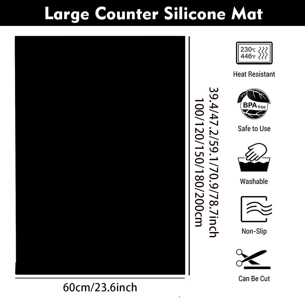 【LARGEST SILICONE MAT】: Mutiple sizes: 40-200cm length, 60cm wide, 0.5mm thickness. This largest silicon mat available to meet your needs about protect all sizes counter top. Its BIG enough for kid lie on the mat or two toddlers to play side by side.