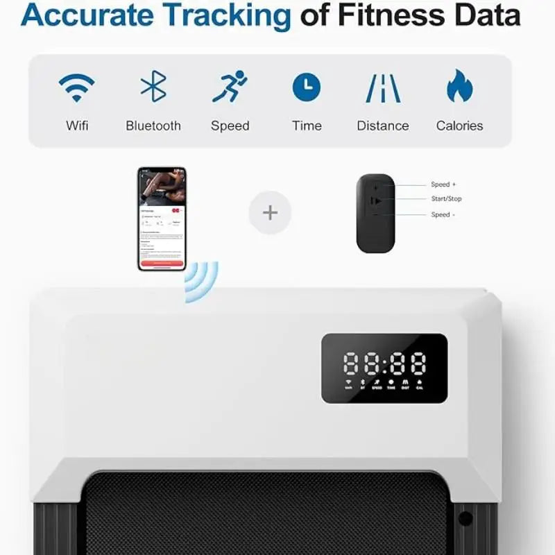 It can track time, distance, speed, and calories. Remote can control your treadmill remotely when you walking or running. The Speed is 0.6-3.8MPH