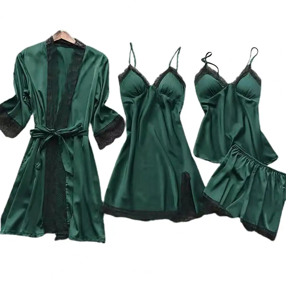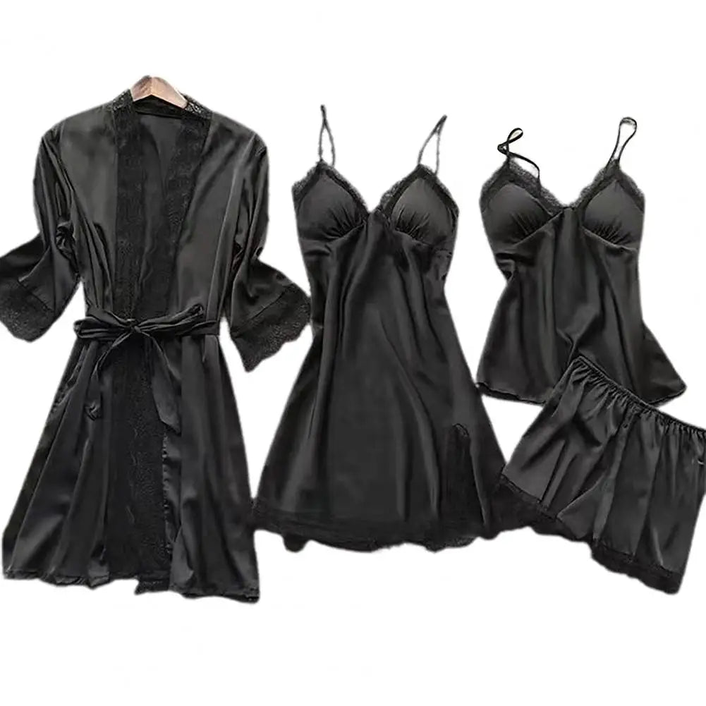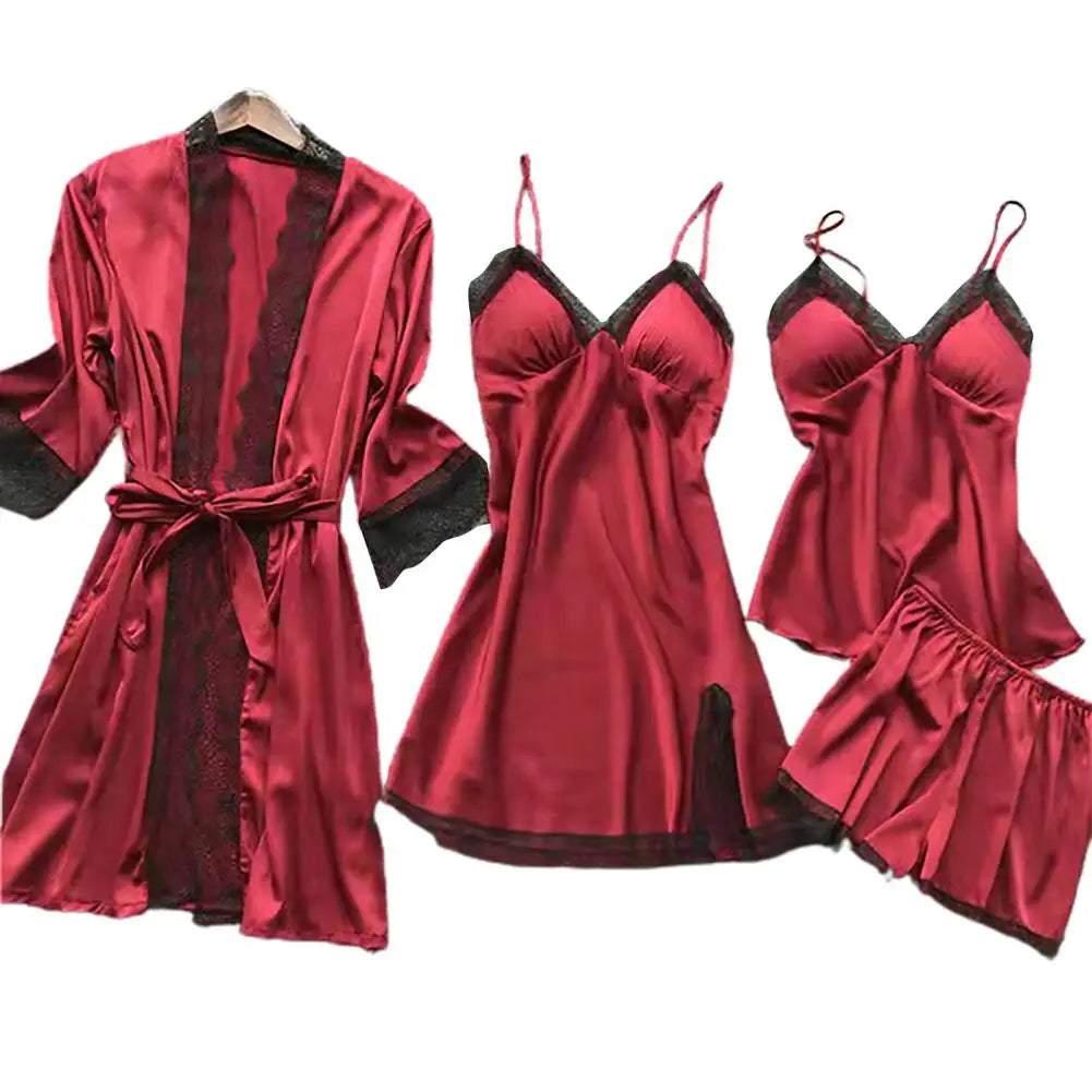 4 Pcs/Set Women Pajamas Set Silky Lace Elastic Waist Color Matching Patchwork Split Hem Spaghetti Strap Padded Pleated Cardigan Coat Top Dress Shorts Set Homewear Clothes