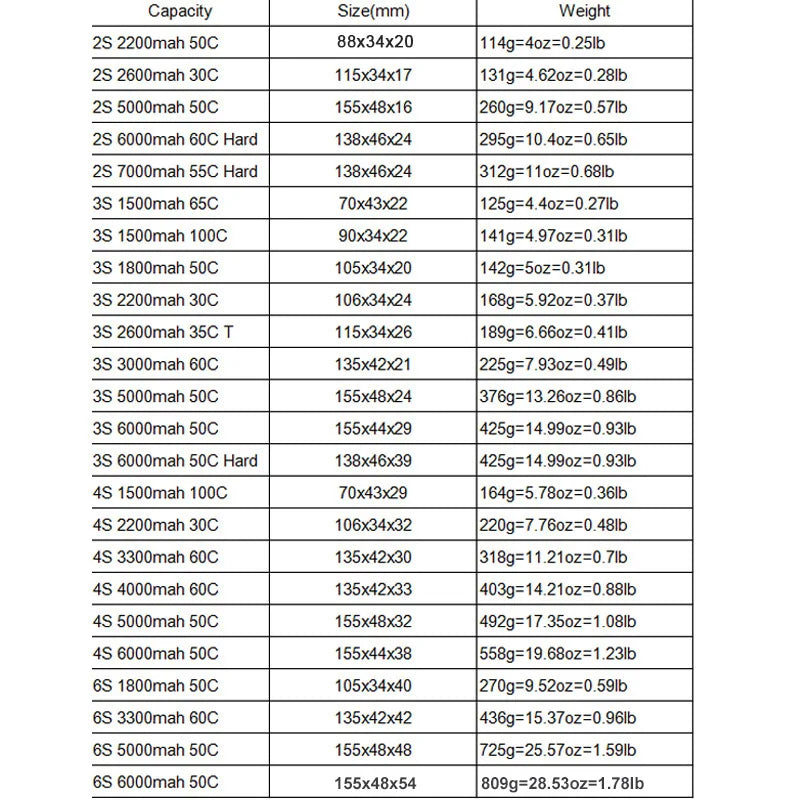 Size: 7.4V 11.1V 14.8V 22.2V