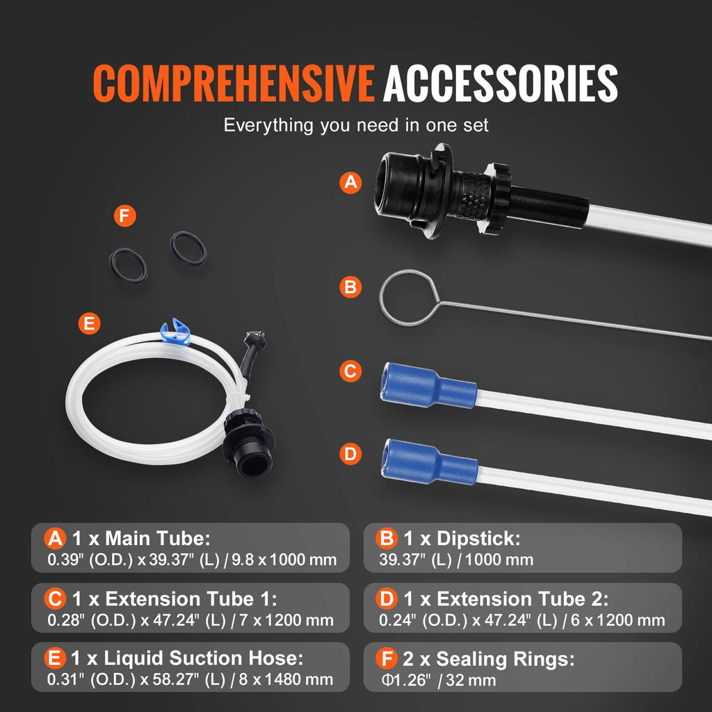 Thorough Fluid Extraction: With four sizes of suck-it-all-up oil extractor tubes, you're reaching the deepest depths, leaving tanks dry. Main Tube: 9.8" x 39.37" / 249 x 1000 mm; Extension Tube 1: 0.28" x 47.24" / 7 x 1200 mm; Extension Tube 2: 0.24" x 47.24" / 6 x 1200 mm; Suction Hose: 0.31" x 58.27" / 8 x 1480 mm.