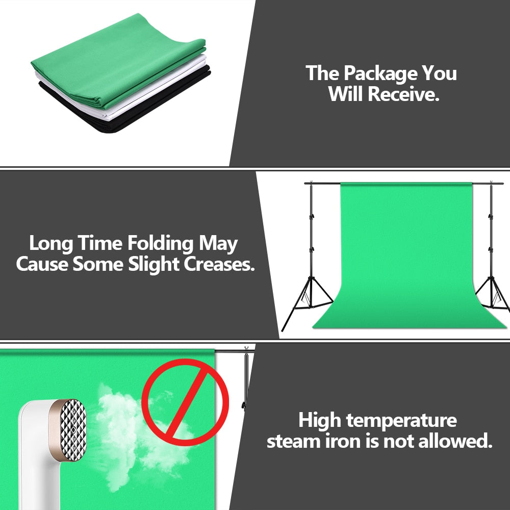 【Upgraded Backdrops】This kit comes with 3 x 1.6x3m Non woven Fabrics Backdrops( Black,White,Green ),The backdrop have been upgraded, It is non-reflective and easier to handle and maintain. Helps to bounce the light and helps brighten everything up. Can also help brighter colors, such as red and orange, stand out more. 【Adjustable Background Stand】This kit is a professional support with Adjustable Height( Min 2.3 ft – Max 6.6 ft ) and Width( Min 4 ft – Max 6.6 ft ). Made from aluminum alloy with a professional black stain finish. Can be assembled by one person in just a few minutes. The support stand also has universal 1/4" thread(spigot/stud), can be used as light stand, you can attach almost all light assemblies on it. 【Application】This product contains 4 kinds of background fabrics in common colors, suitable for various scenes (studio, family, wedding, party, portrait product photography, video production, etc.) to meet the different needs of customers. This product is a professional photographic background for photographers, but whether it is a novice or a professional photographer, the use of this product is very simple and convenient. 【Background Clips】This clamp has a sturdy grip with gentle,pivoting pads that adjust to the grip surface.Small teeth on the inner diameter hold muslin cloth or paper backdrops in place for photo work. It can hang paper/ plastic/non-woven backdrops and all kinds of photography. 【Requires Attention】Since we are transported after folding, the background cloth you receive will inevitably have creases. At this time, you only need to open the background cloth, suspend it, and let it stand a few days to remove the wrinkle; Can use a wet towel to wipe the creases and then use a book to press it for a while; Or roll the backdrop up and put it aside.**High temperature steam iron is not allow. Package: 1 x 1.6*3m Black Backdrop 1 x 1.6*3m White Backdrop 1 x 1.6*3m Green Backdrop 1 x 2m*2m Background Stand 1 x Carrying Bag for Background Support 3 x Clamps