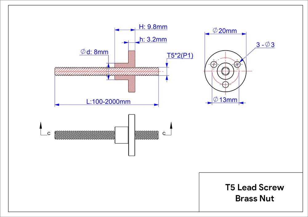 CNC 3D Printer Trapezoidal Screw Rod T5 Lead Screw Thread 5mm Lead 1mm 2mm 4mm Length 100mm 150mm 200mm 250mm with Brass Nut