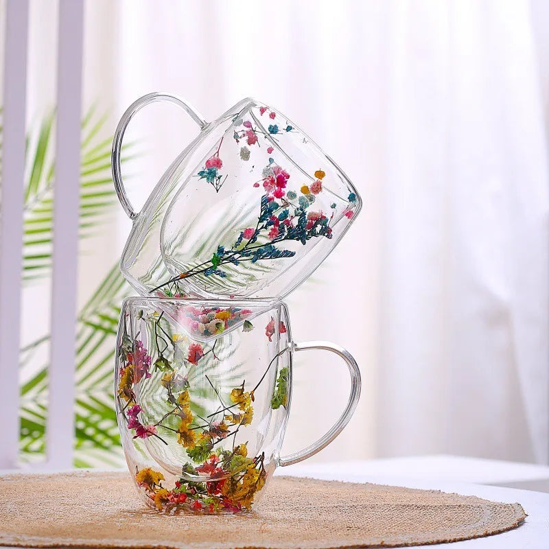 1pc 250ml 350ml Artificial Flower Pattern Heat Insulated Water Cup Double Walled Glass Coffee Mug Reusable Handwash Glassware