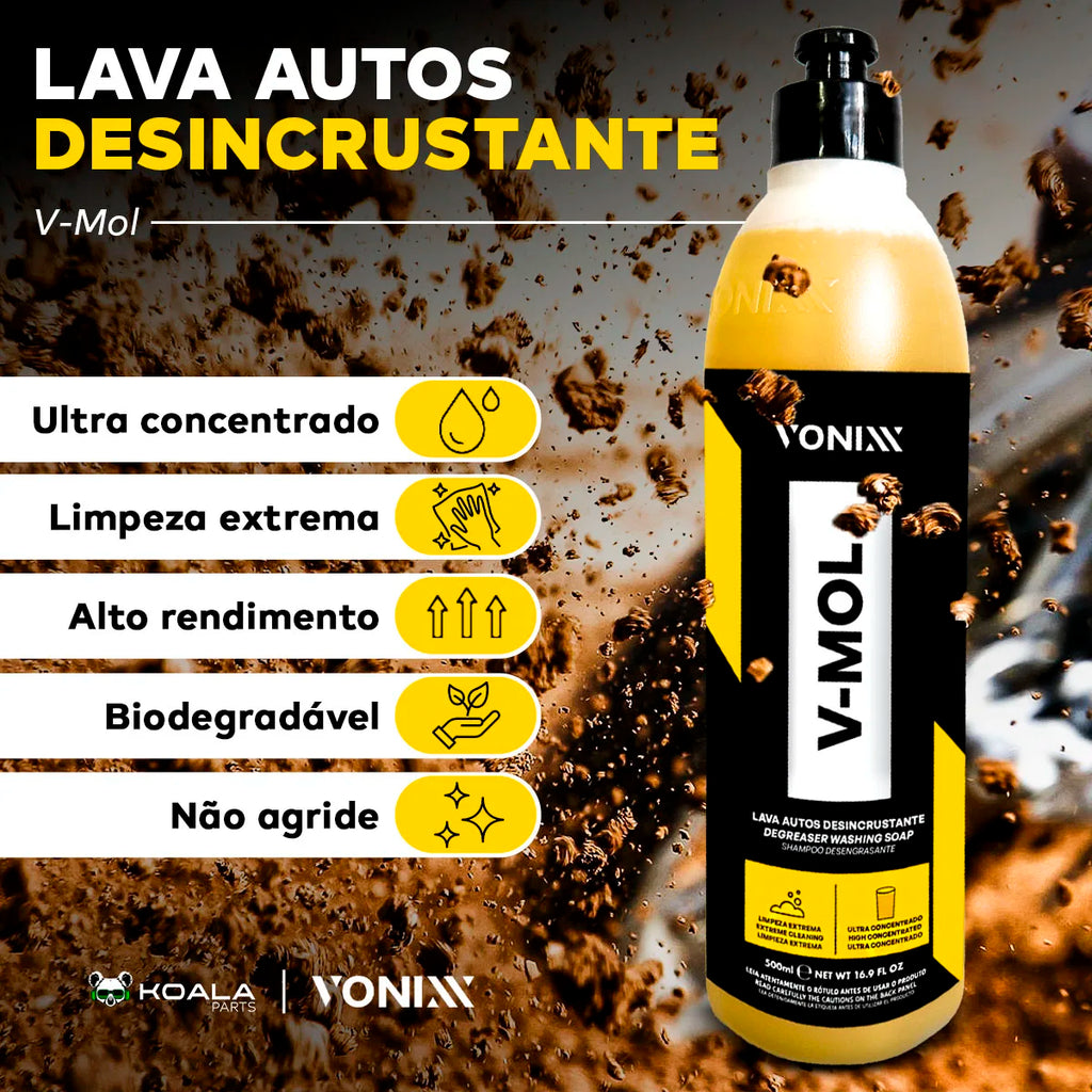 Welcome to Koala Parts! Your right choice for automotive parts and accessories-For more than 10 years offering quality and reliability. Shampoo Automotive Lava Heavy Cleaning Clay Vmol 500ml Vonixx THE BEST DISINCRUSTRANT MOL IN THE MARKET Eliminate mud, oil and extreme dirt effortlessly, keeping the paint protected and the vehicle's shine. V-Mol is a high-performance auto descaling and degreasing washer designed to remove heavy dirt without damaging the surface. With biodegradable formula. • Removes Clay, oil and difficult dirt • Safe for paint and sensitive surfaces • Best cost-benefit market • Ultra concentrate: Several dilutions APPLICATION -Exterior of vehicle -Wheel's Box HIGH CLEANING POWER Removes from lighter to heavier dirt, such as clay, oil and other difficult stains. HIGH PERFORMANCE AND SUSTAINABILITY Technological and biodegradable formula, promotes effective cleaning without damaging the vehicle paint. INCREDIBLE YIELD Ultra concentrate for various dilutions with a high yield power. IDEAL DILUTION FOR EACH NEED -Light dirt/maintenance: 1:100 -Average Dirt: 1:50 -Heavy Dirt 1:10 HOW TO USE 1. Dilute the product in the desired proportion; 2. Start washing with the aid of a microfiber glove, starting from the upper parts of the vehicle; 3. Rub the product gently on the entire surface of the vehicle; 4. Wait a few minutes for the product to act; 4. Then rinse with a high-pressure washer until all the product is removed; 5. Dry the entire surface in order to avoid staining. TECHNICAL SPECIFICATIONS: -Volume: 500mL -Descaling -High power of cleaning -Ultra concentrated -Dilution: Light Dirt/Maintenance: 1:100 Average Dirt: 1:50 Heavy Dirt 1:10 Physical State: Viscous Liquid -Color: Orange Yellow -Odor: Intense Cherry -PH: 11.0-11.5 -Soluble in water CONTENTS OF PACKAGING: -01. Auto Descaling Wash V-Mol 500mL Vonixx
