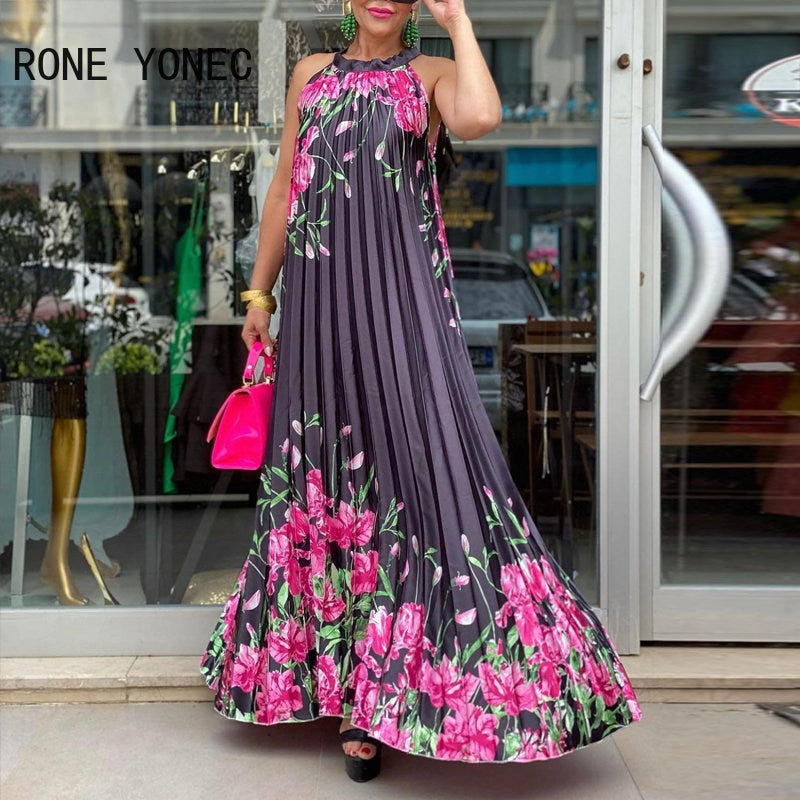 Women Elegant All Over Print with Floral Pattern Halter Pleated Sexy Maxi Summer Vacation Dresses
