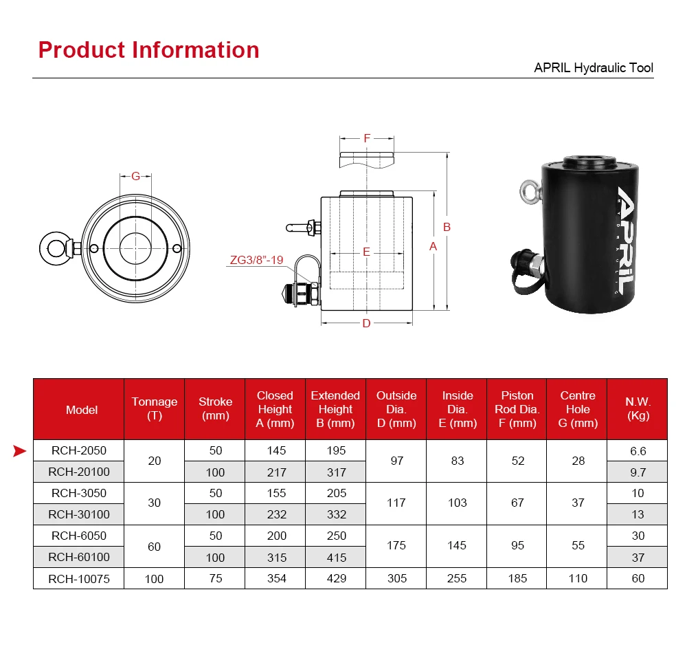 20Ton 50mm Hydraulic Hollow Plunger Jack Hollow Plunger Ram Hydraulic Hollow Cylinder RCH-2050