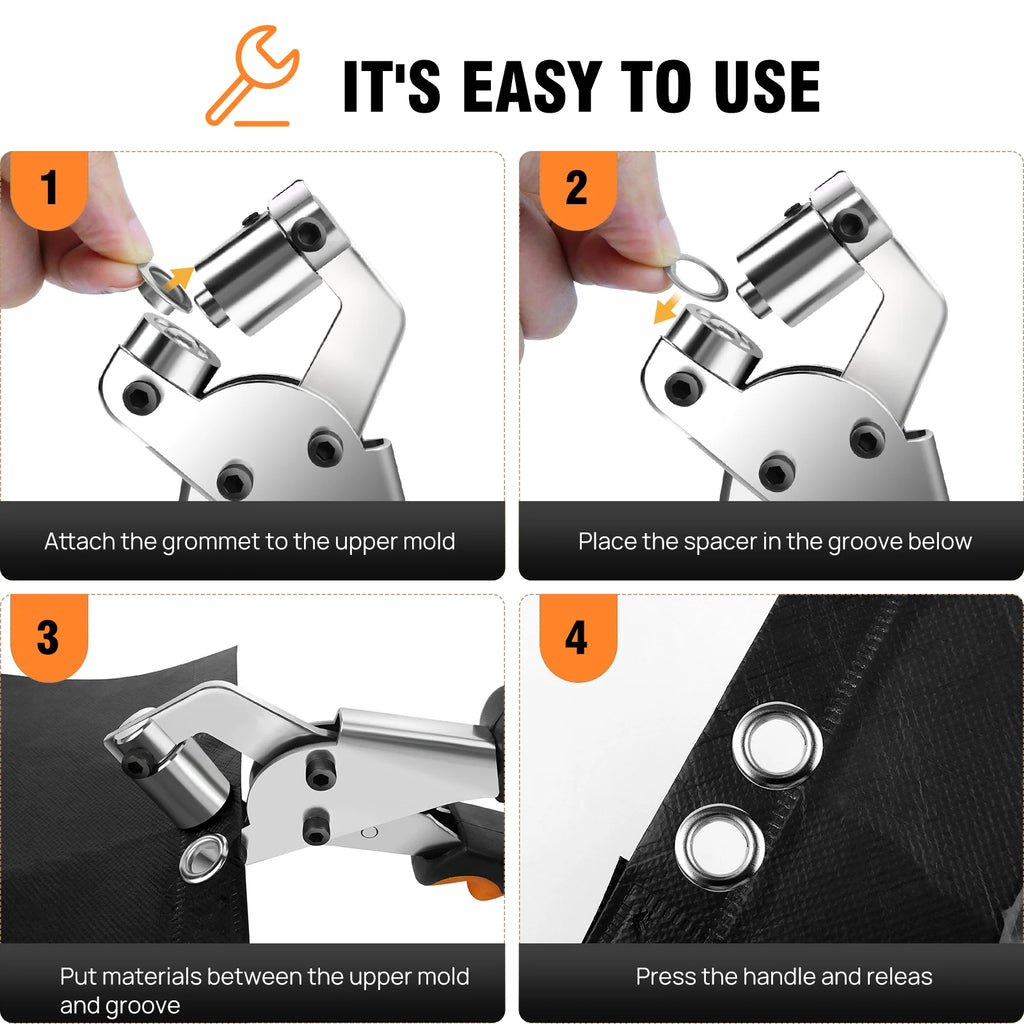 【Portable & Flexible use】This grommet tool kit characterizes a special lightweight design, it is flexible for all angles of use. With a returning spring inside, automatic return after pressing and suitable for indoor or outdoor set-up, repair, and decorating works, etc.