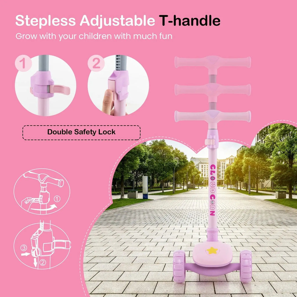 Freely Adjustable Height: This folding kick scooter boasts 63-83 cm adjustable height, which adapts to kids of different heights. As a result, it is a perfect gift for kids aged 37-60 months old. By the way, the height adjustment is controlled by a double lock system that avoids kids to adjust by accident.  LED Lighted PU Wheels: Built with battery-free LED lights, the wheels illuminate with each roll for enhanced visibility. The faster the speed, the brighter the light. What’s more, the PU wheels are shock-absorbent and anti-skid, going well on different types of road, like the asphalt road, cement road and wooden floor.  Lean-to-steer Function: The 3-wheel scooter is designed with the lean-to-steer technology to promote motor skills. Children are able to turn by leaning their body instead of turning the handlebar, which is conducive to the development of balance, coordination and confidence.  Foldable and Lightweight Design: This toddler scooter comes with full assembly for great convenience. Likewise, with a simple pull and push, it can be folded quickly for space-saving storage. Furthermore, it is easy for kids to take the scooter for any outdoor adventure thanks to its lightweight design.  Specially Designed or Little Ones: Featuring an easy-to-grip handlebar, this folding kids scooter assures a comfortable grip. Additionally, the 13 cm extra-wide deck with a safe fender brake allows for a smooth ride and quick stop. And the adorable patterns are appealing to little ones.  Specifications Materials: PP, PU, ABS, Metal Product Dimension: 60 x 28 x 63-83 cm (L x W x H) Folding Dimension: 64 x 28 x 16 cm (L x W x H) Diameter of Front Wheel: 12 cm Net Weight: 3 kg Weight Capacity: 50 kg Suitable Ages: 3-5 Years Old Package Includes: 1 x Folding Kick Scooter 1 x Instruction manual