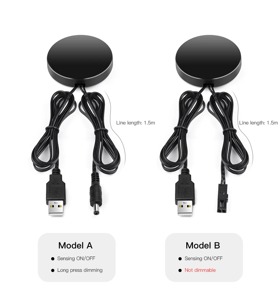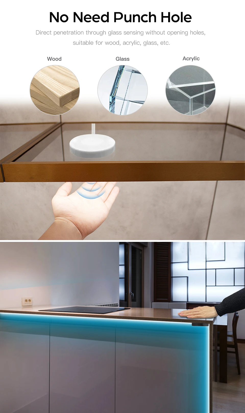 1.The Smart touch dimmer control sensor switch is used behind wood board (like kitchen cabinet ,wardrobe, closet..) or glass mirror. It can work on dc 5V led light, And it more flexible to stick anywhere you like,simple and easy to instation. DON'T NEED OPEN HOLE!!!