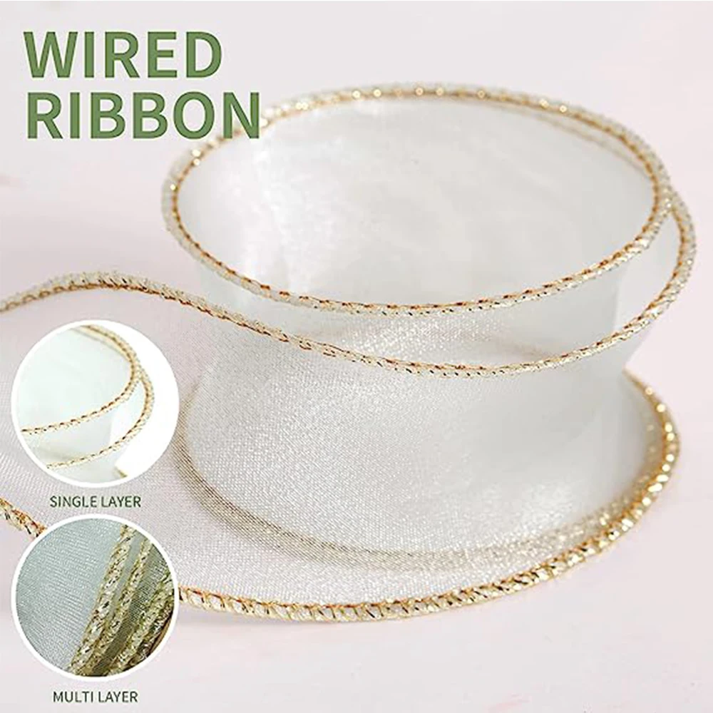 10Yards Sheer Wired Organza Ribbon With Golden Edge Chiffon Ribbon for Wedding Birthday Gift Bouquet Wrapping DIY Decorations