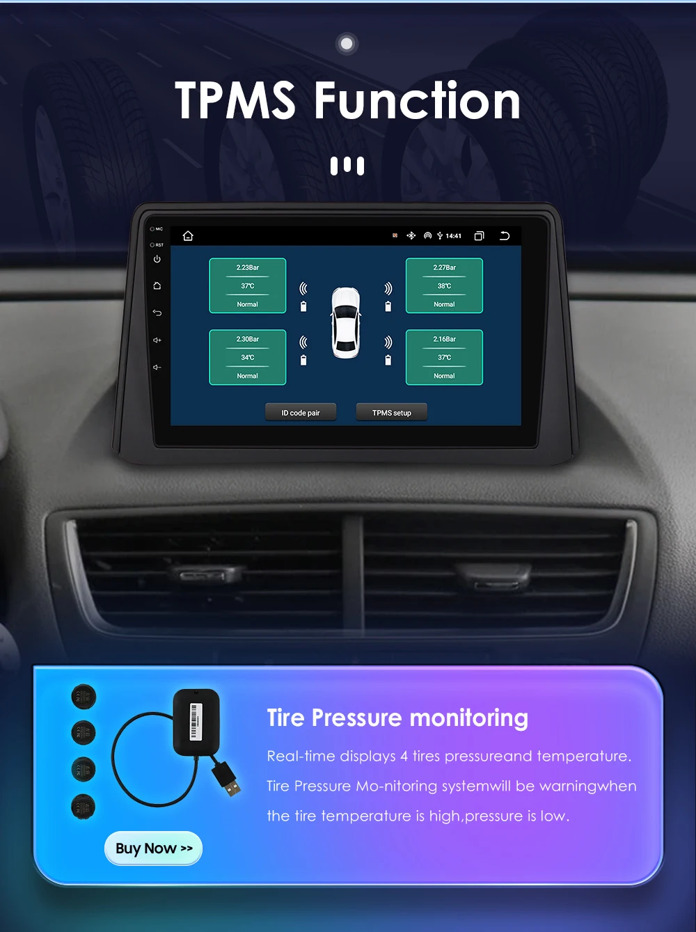 TPMS Function( Needs to order separately) : Tire Pressure Monitoring: Real-time displays 4 tires pressure and temperature,Tire Pressure Monitoring system will be warning when the tire temperature is high, pressure is low.
