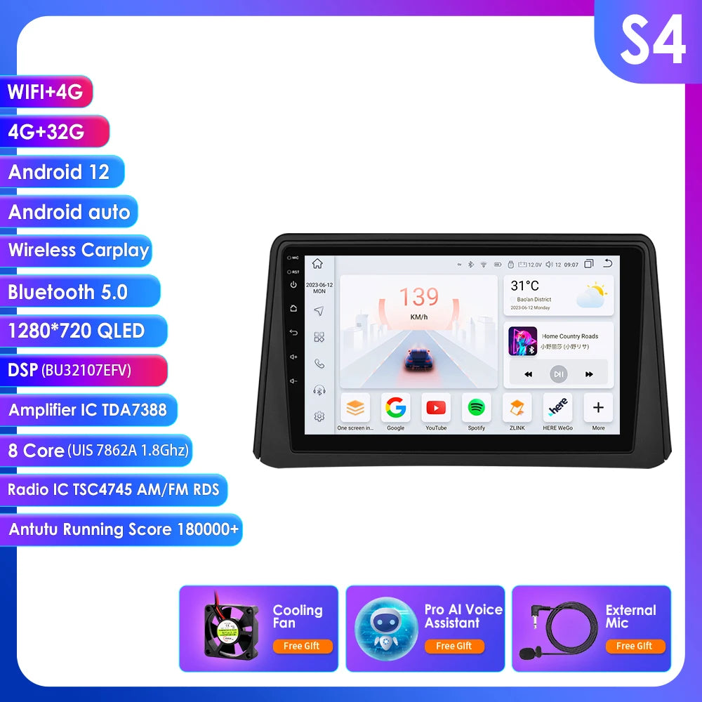 -----> Basic functions: Android 12 + 9 inch Display Screen + Quad Core 1.2GHZ (Eight core UIS 7862A 1.8Ghz / UIS 7862S 2.0Hhz optional)+ DDR3 1GB Flash (2GB/3GB/4GB/6GB/8GB optional) + 16 GB Memory (32GB/64GB/128GB optional) + WIFI (4G Network optional)+ Mirror link+ Steering Wheel Control + RDS+DSP(optional)