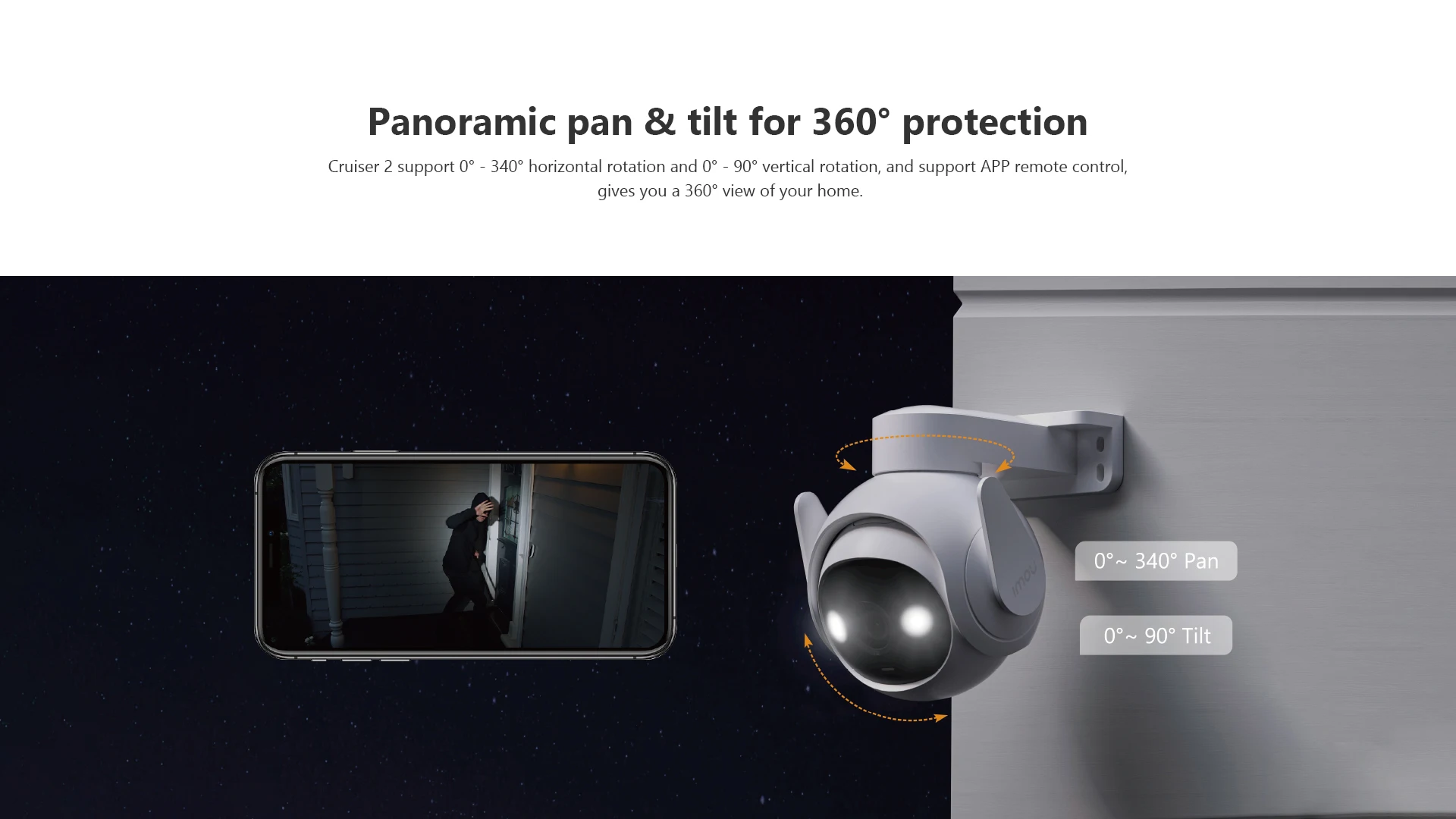 Cruiser 2 support 0°~340° horizontal rotation and 0°~90° vertical rotation, and support APP remote control gives you a 360° view of your home.
