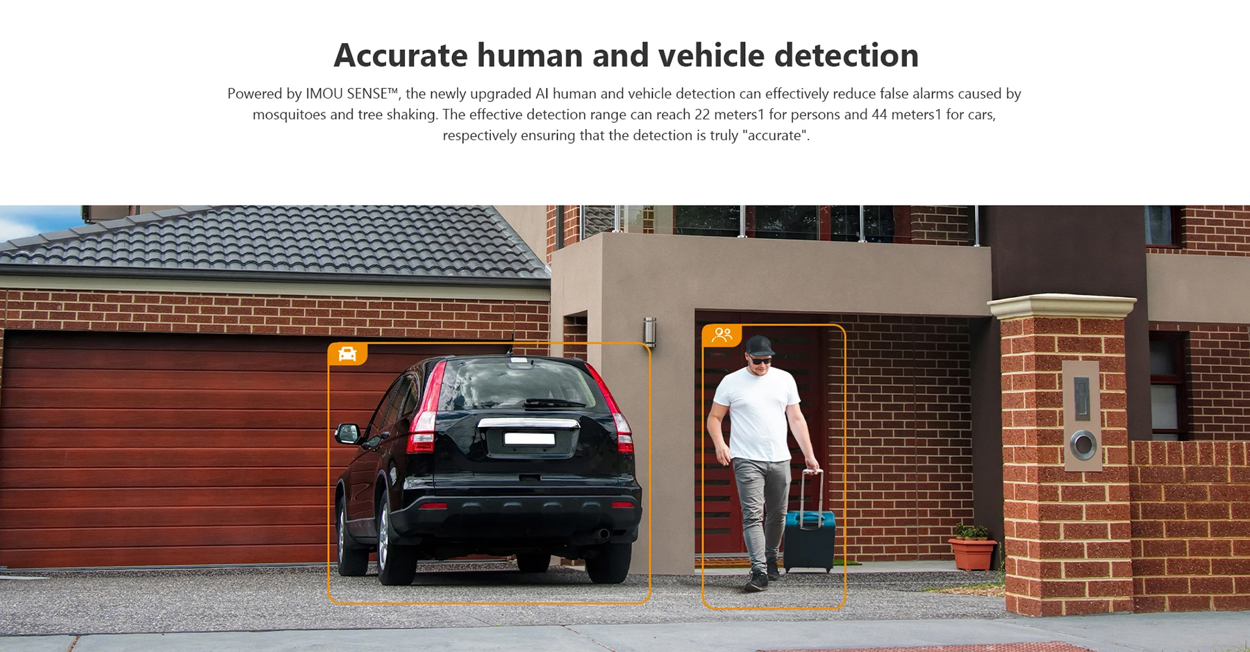 Powered by IMOU SENSE™, the newly upgraded AI human and vehicle detection can effectively reduce false alarms caused by mosquitoes and tree shaking. The effective detection range can reach 22 meters for persons and 44 meters¹ for cars, respectively ensuring that detection is truly "accurate".