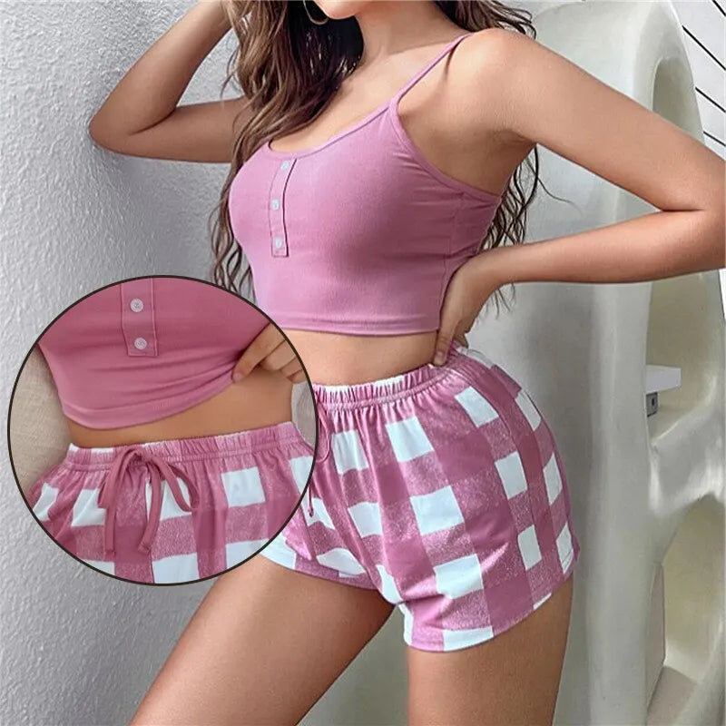 2 Pieces Print Sleepwear Silk Satin Sleeveless Nightwear Pyjamas Fashion Sexy Pajama Women Shorts Pajamas Set