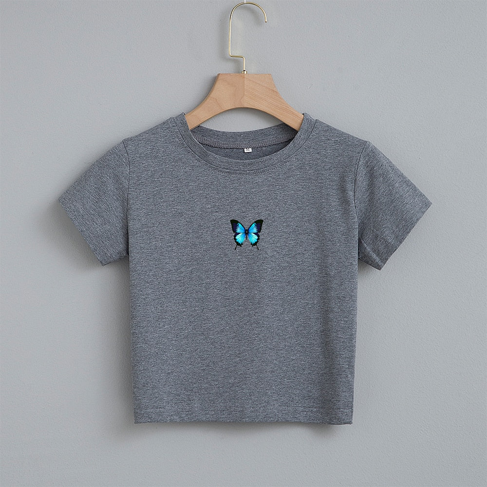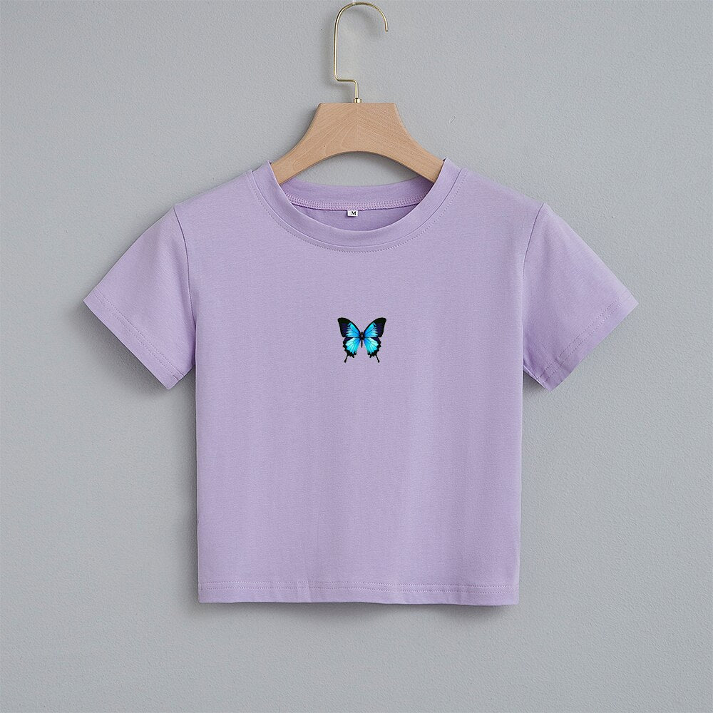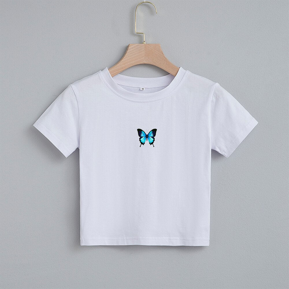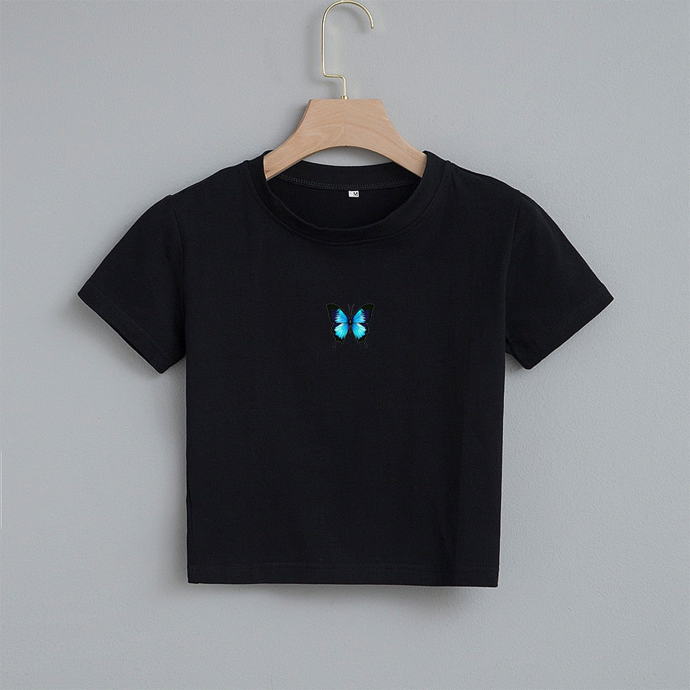 Fashion Cartoon Blue Butterfly Print Crop Top Harajuku O Neck Cropped T Shirt Cute Women T-shirt Gothic Women Tshirt Streetwear