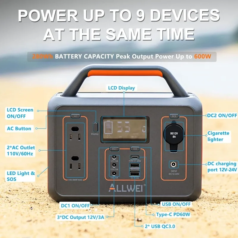 🚗【Power Your Outdoor Life】ALLWEI portable power station (size: 9x4.7x7.8 inches, weight: 6.5 LBS), is equipped with 280Wh/78000mAh capacity, peak 600W, silent cooling fan, built-in 3-level LED light and SOS mode to satisfy your outdoor needs. LCD screen shows all power station operating status easily and timely. Perfect for emergency power supply, outdoor activities and home backup.