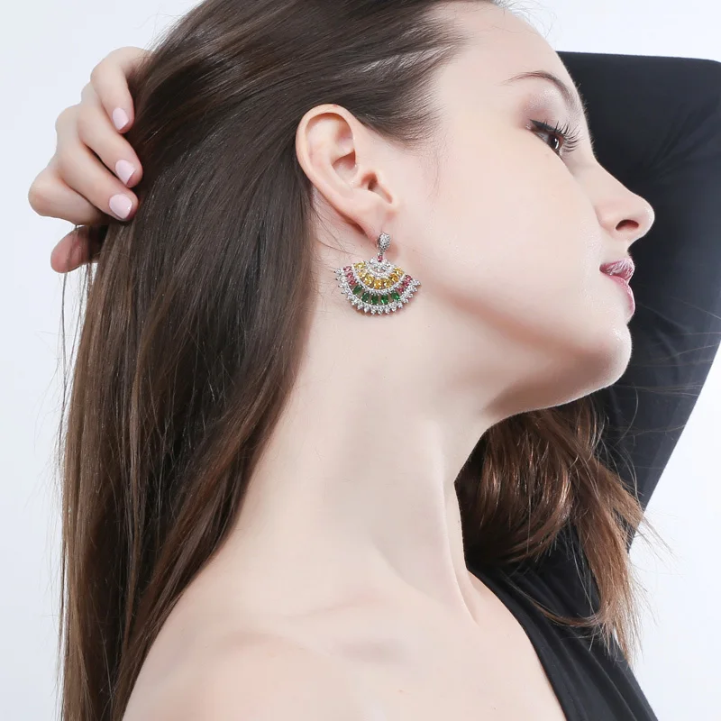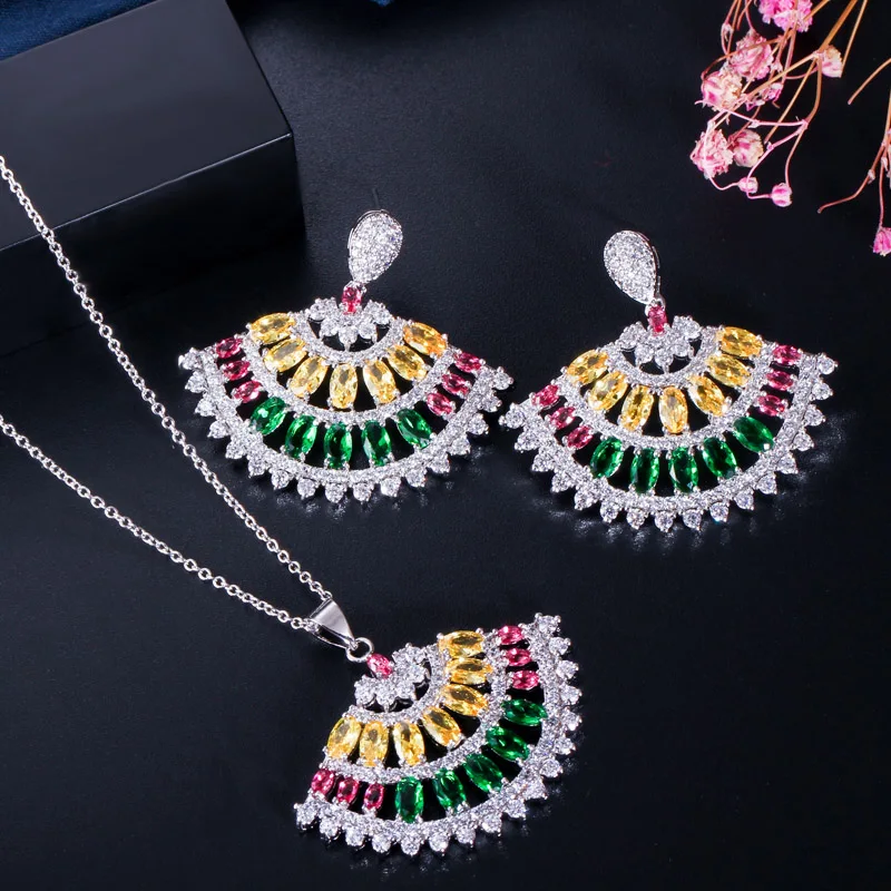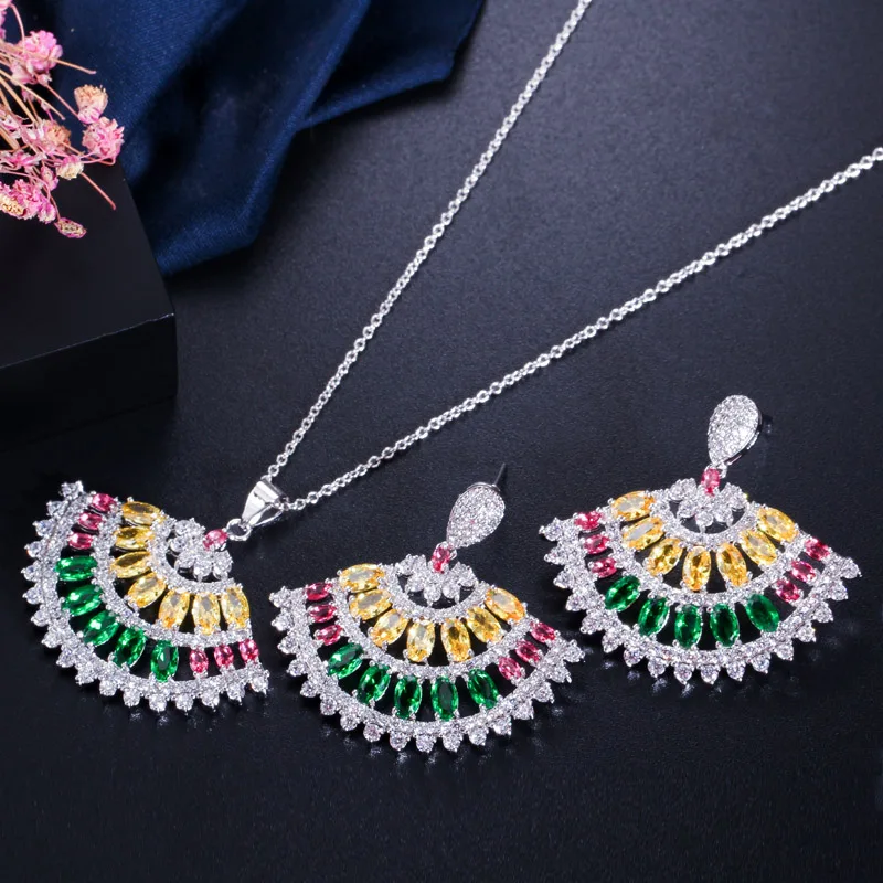 CWWZircons Multi Yellow Green Color Cubic Zirconia Crystal Elegant Fan Shape Necklace and Earrings Women Brand Jewelry Sets T340