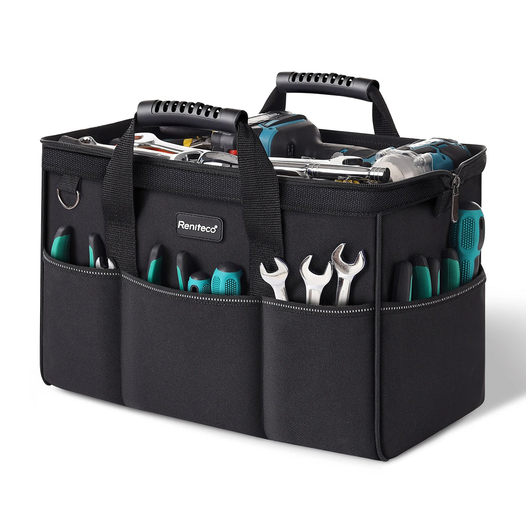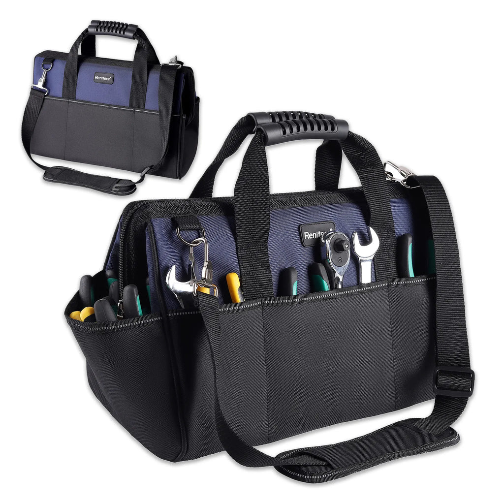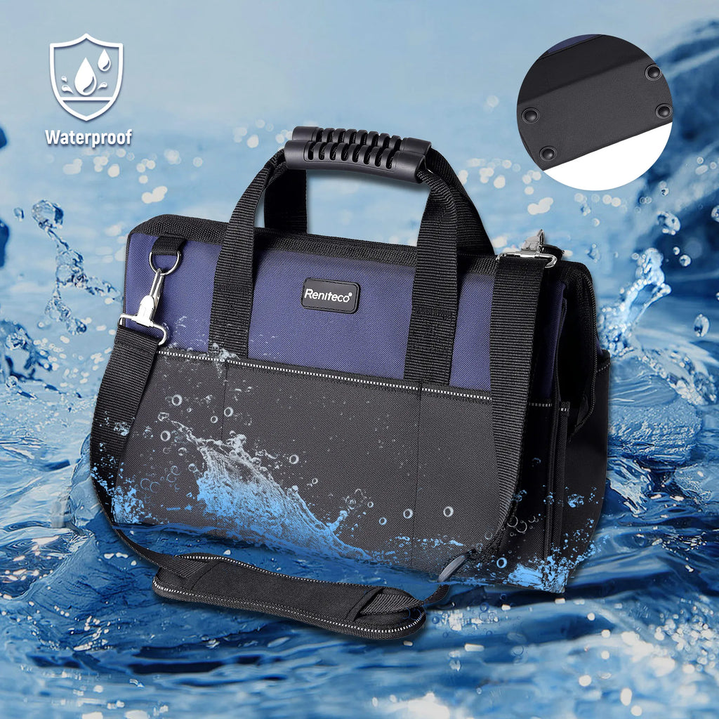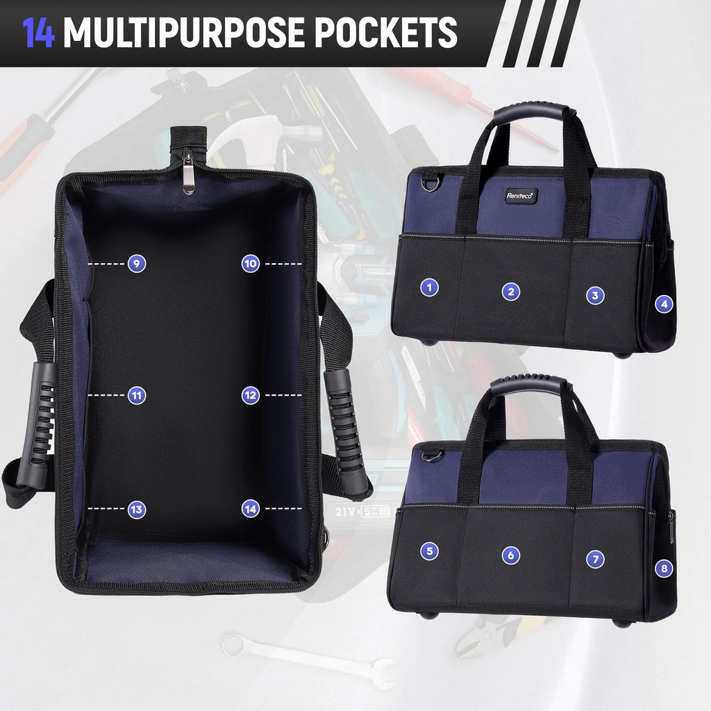 Reniteco 16 inch Tool Bags Heavy Duty Organizer Bag For Work Tools, Fabric Tool Tote, Multi-Pockets Wide Mouth Soft Bottom Blue