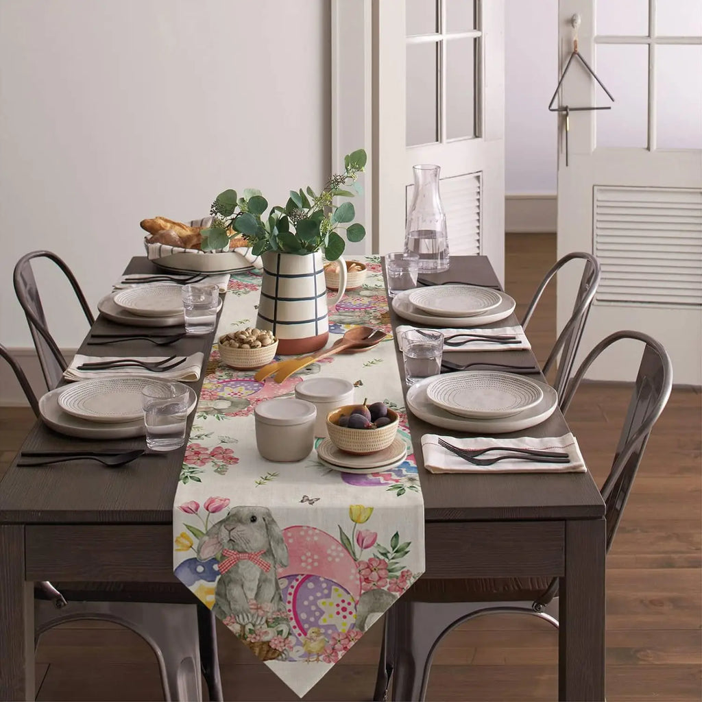Bunny Eggs Flower Tulip Easter Linen Table Runners Dresser Scarf Table Decor Washable Kitchen Dining Coffee Table Runners Decor