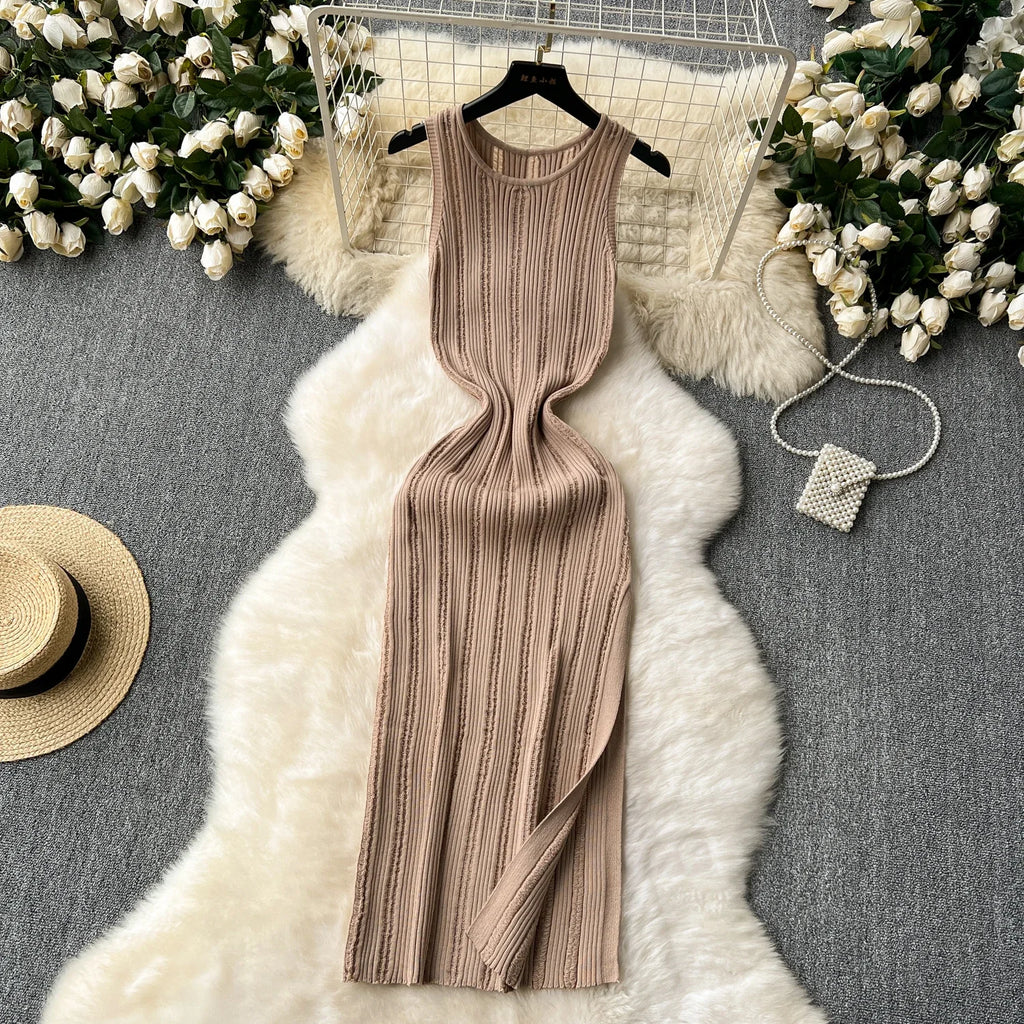 Green New Summer Knit Sexy Strap Dress Women Tank Elatic Waist Bodycon Sundress Female Beach Split Maxi Long Dress
