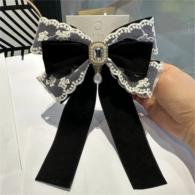Introducing our Korean Fabric Lace Bow Brooches for Women! With its exquisite fabric bow and intricate lace design, this brooch is the perfect addition to any outfit. The beautiful rhinestones and pearls add a touch of glamor and sophistication, making this brooch the ideal accessory for formal occasions or to add a bit of sparkle to your everyday look. This badge is a popular fashion trend in Korean fashion and is sure to turn heads. Use this crystal pearl badge as a stylish shirt collar pin to elevate your office attire or wear it as a fashion statement on your sweater, scarf, or coat. This brooch is perfect for women who love to add a touch of uniqueness to their style. Don't miss out on this fashion bowknot badge jewelry accessory and get yours today!