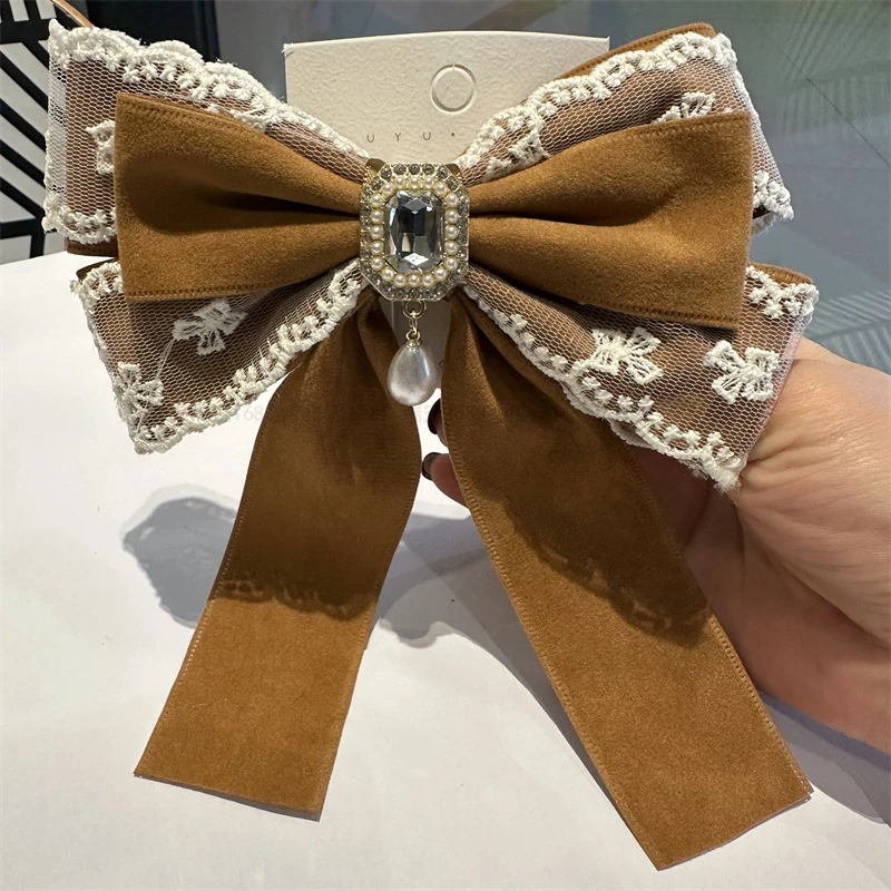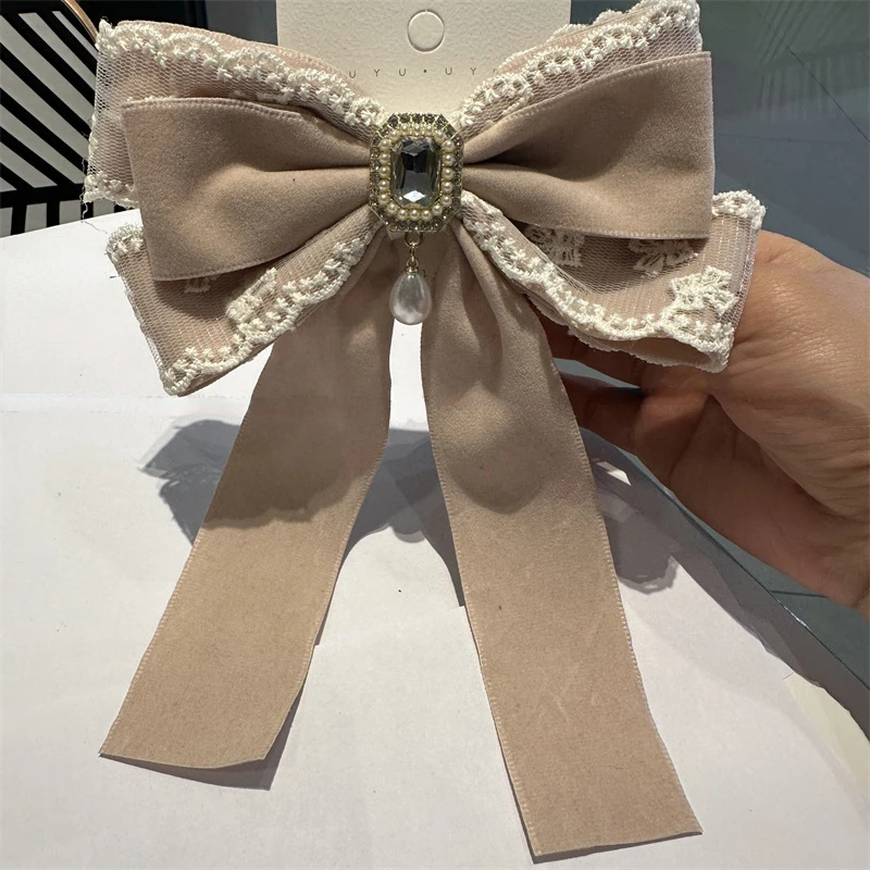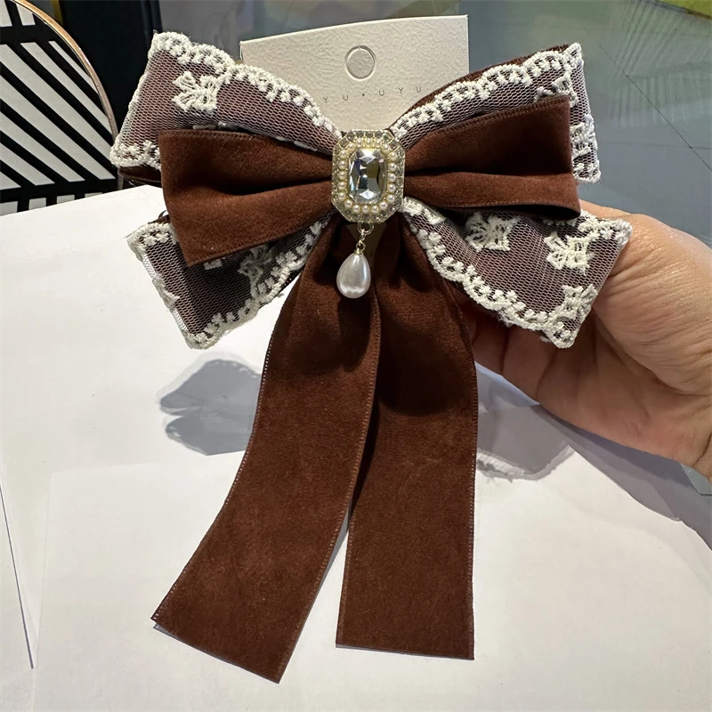 Korean Fabric Lace Bow Brooches for Women Rhinestone Pearl Shirt Collar Pins Fashion Bowknot Badge Jewelry Accessories