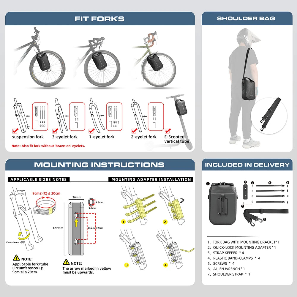 Easy and quick installation: use the quick locking system (mounting bracket and adapter) to connect the bag to the front fork or pipe. With the quick release function, you can simply move the release lever and pull the bag up for quick removal and use.