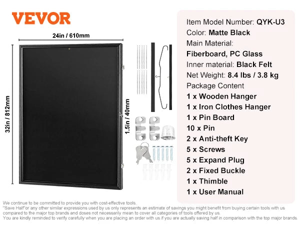 1 × Wooden Hanger 1 × Iron Clothes Hanger 1 × Pin Board 10 × Pins 2 × Anti-theft Keys 5 × Screws 5 × Expandable Plugs 2 × Fixed Buckles 1 × Thimble 1 × User Manual