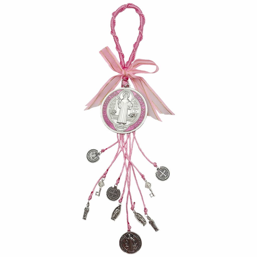 Saint Benedict Medal Protection Blessing Charm Pink Enamel Double Side Catholic San Benito Medalla Cross Charm Handmade Easter Day's Gift Car Hanging Charm for Men Women