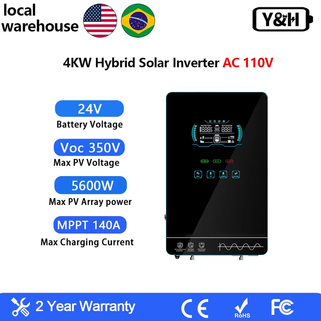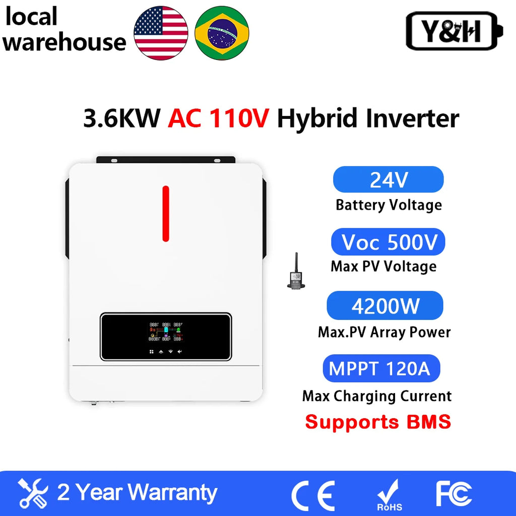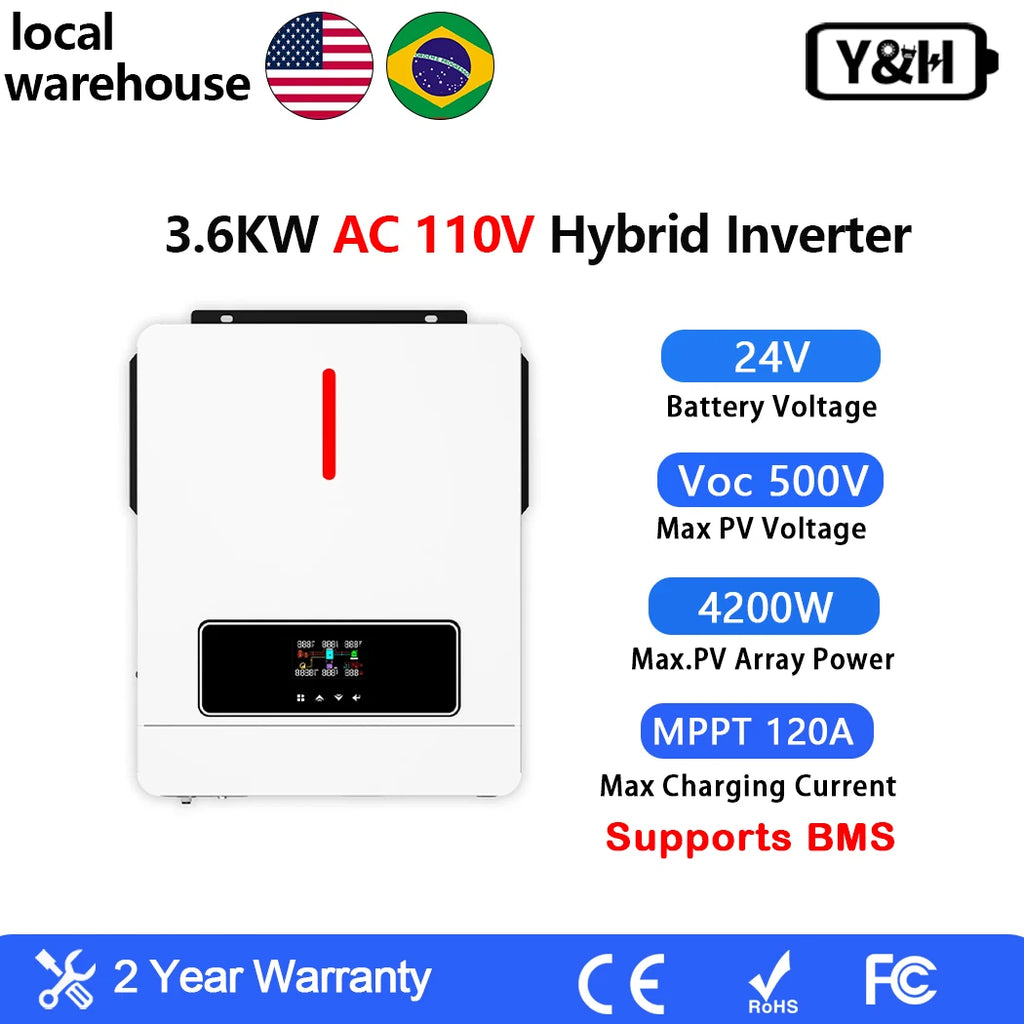 Y&H 3.6KW 4KW Hybrid Solar Inverter 24VDC 110VAC Pure Sine Wave Hybrid Inverter 120A MPPT Solar Controller Run Without Battery