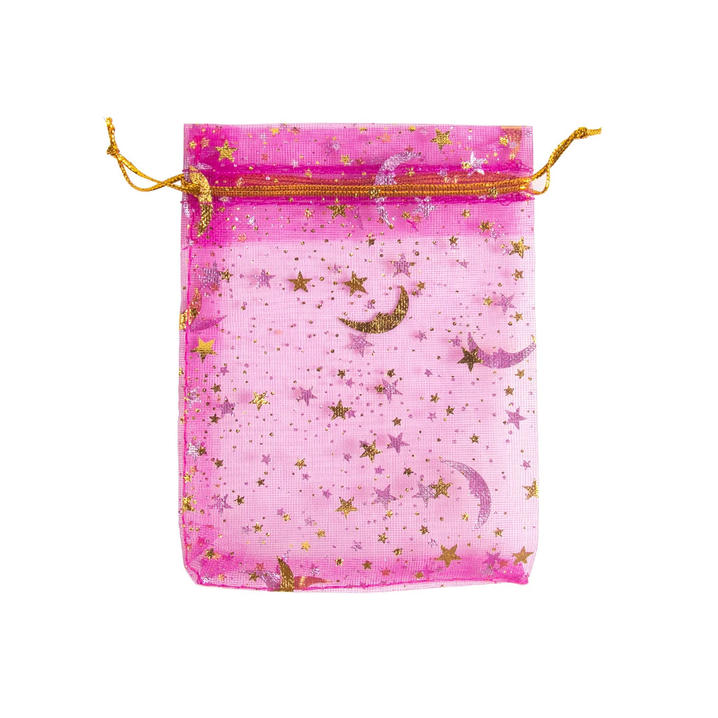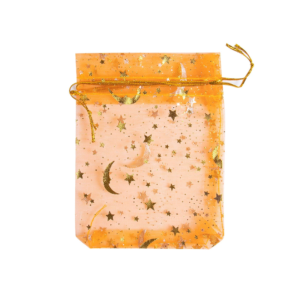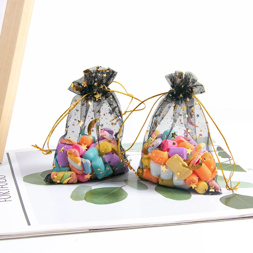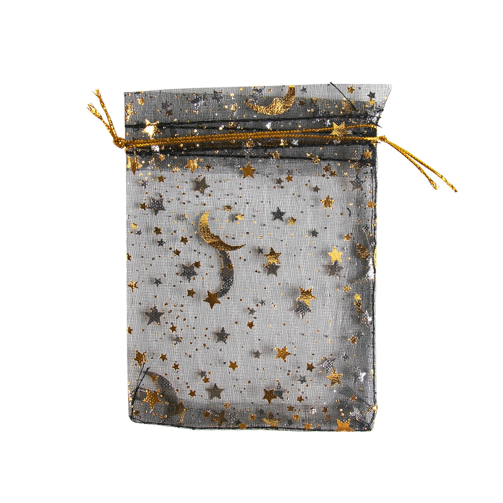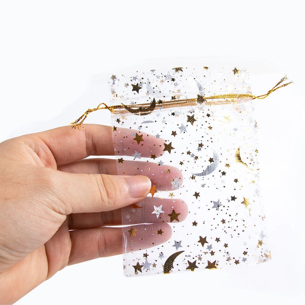 50Pcs Eid Mubarak Decoration Mesh Bag Organza Hot Stamping Silver Star Moon Candy Gift Drawstring Packaging Bag Party Supplies
