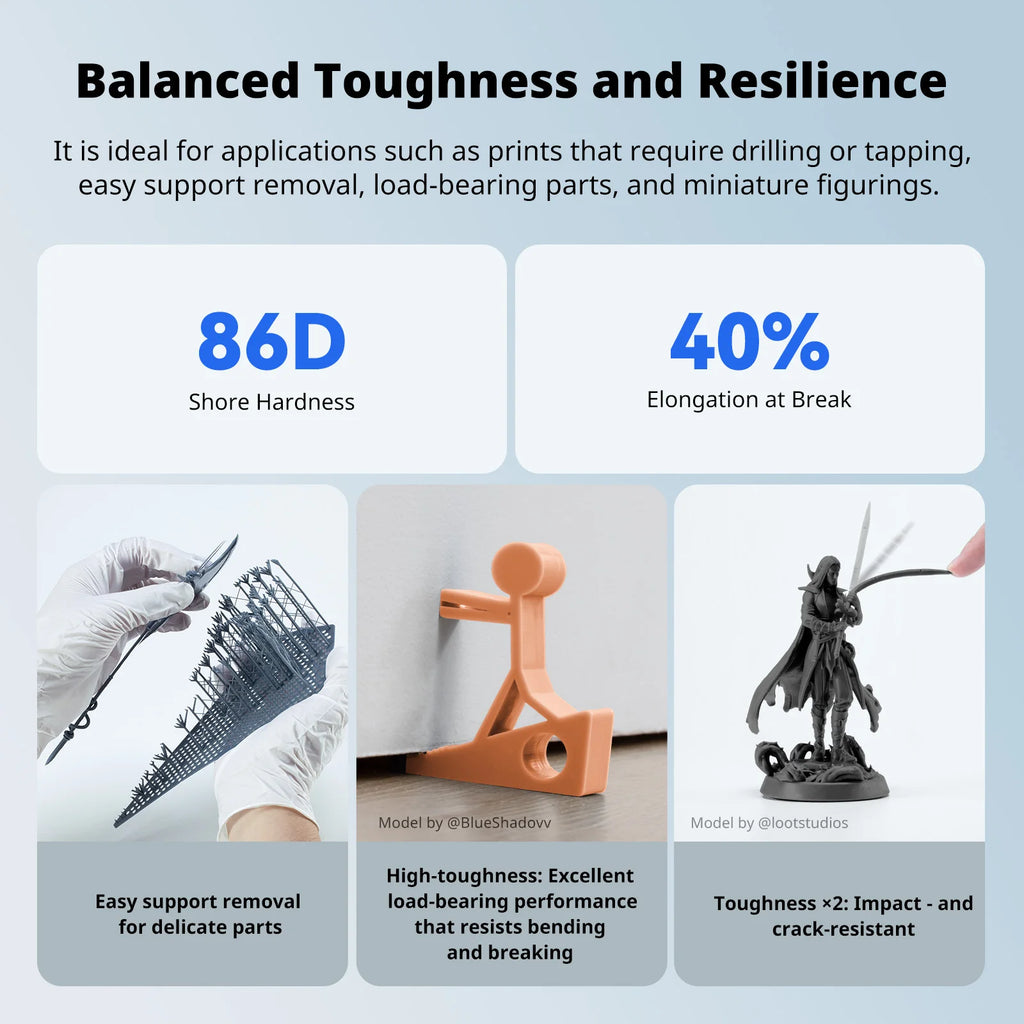 With lower viscosity and high fluidity, the resin reflows back to the print area more quickly, reducing overall print time.