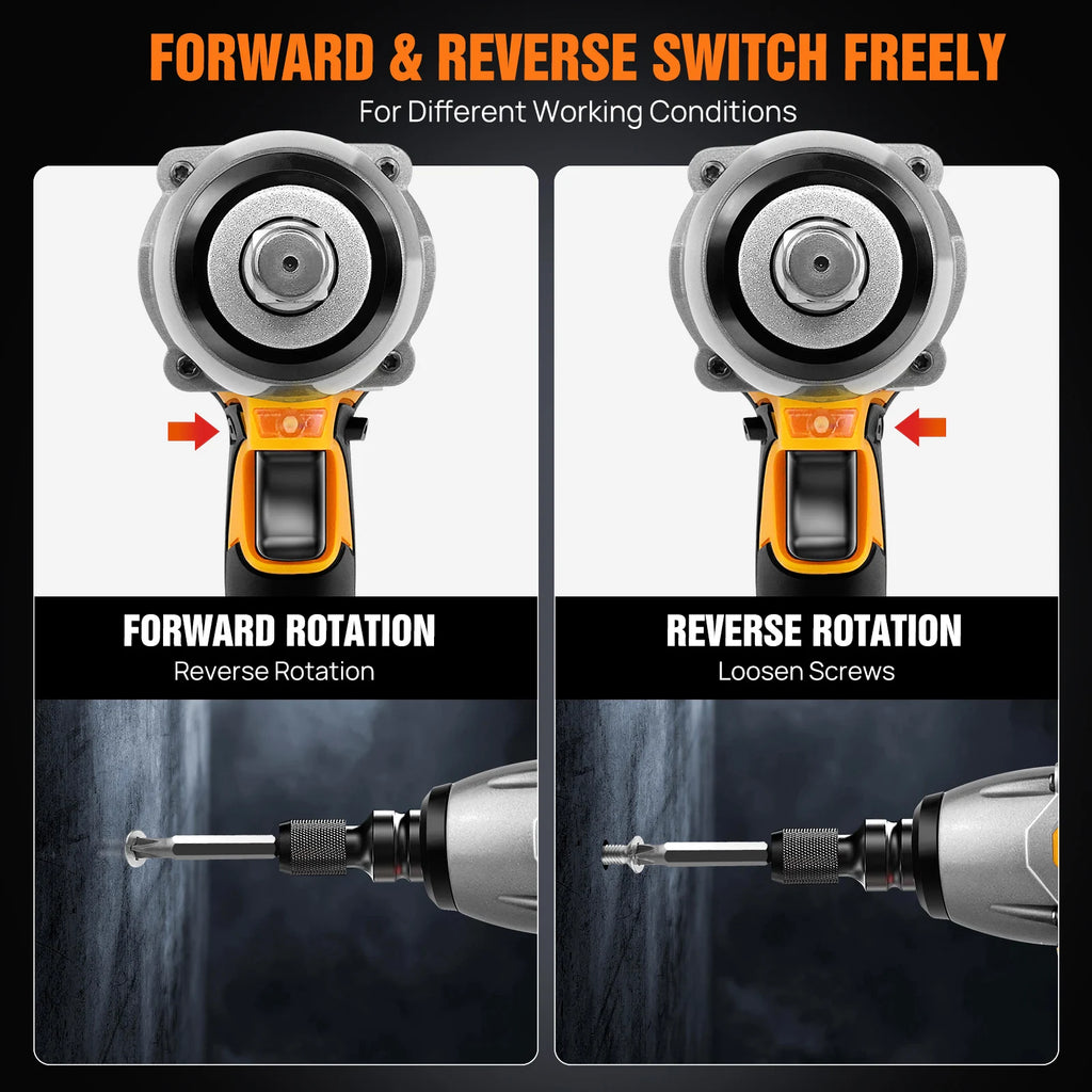 ✅【Two Directions & Brake-stop】This impact wrench can cooperate with locking protection, forward and reverse Mode. In reverse mode, once the nut or bolt is loosened, the brake stop device will activate and reduce speed and torque to protect the nut from flying into nowhere to catch.