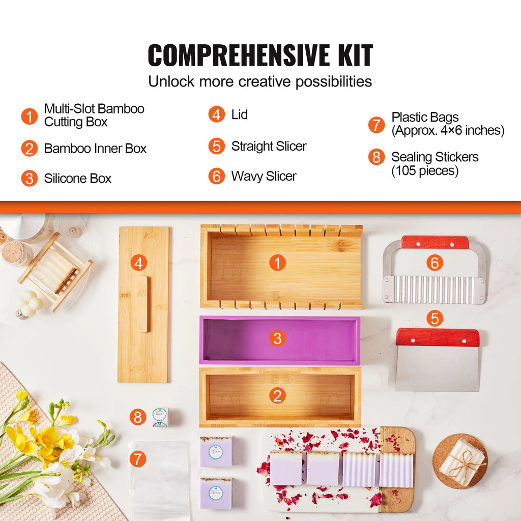 Complete Soap Making Kit: Our supplies include a bamboo box, a silicone mold, 2 stainless steel slicers, 100 plastic bags, and 105 labeling stickers. Everything you need is in one package.