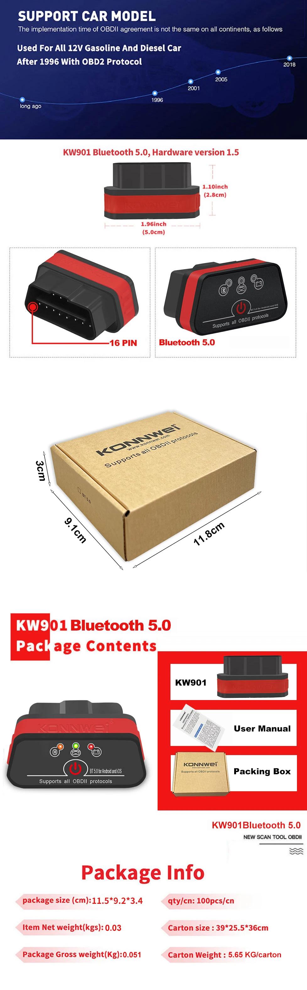 1pc x KONNWEI KW901 BT5.0 ELM327 Diagnostic Interface