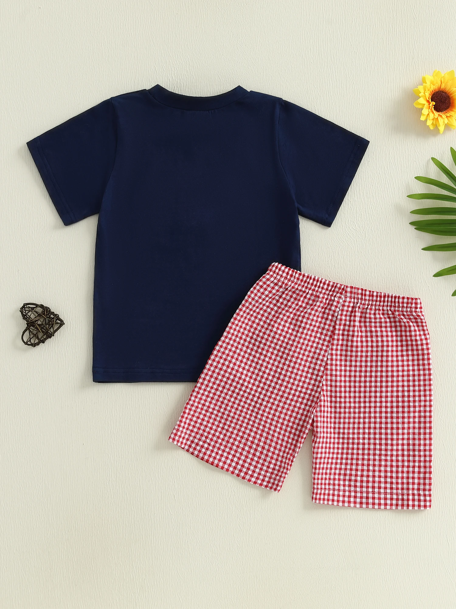 Kids Boys Shorts Set, Short Sleeve Embroidery Truck T-shirt with Plaid Shorts Toddler Set Summer OutfitWhether your little boy is playing in the park or attending a summer party, our shorts set is the perfect choice. Its comfortable, stylish, and sure to make her feel confident and happy.
